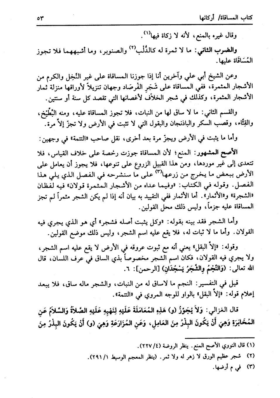 الأصح المشهور: المنع؛ لأن المساقاة جوزت رخصة على خلاف القياس، فلا تتعدى إلى غير موردها، ومن هذا القبيل الزروع على تنوعها، فلا يجوز أن يعامل على الأرض ببعض ما يخرج من زرعها (¬3) على ما سنشرحه في الفصل الذي يلي هذا الفصل. وقوله في الكتاب: "وفيما عداه من الأشجار المثمرة قولان" فيه لفظان "الشجرة" و"الأثمار". أما الأثمار ففي التقييد به بيان أنه إذا لم يكن الشجر مثمراً لم تجز المساقاة عليه جزماً، وليس ذلك محل القولين.