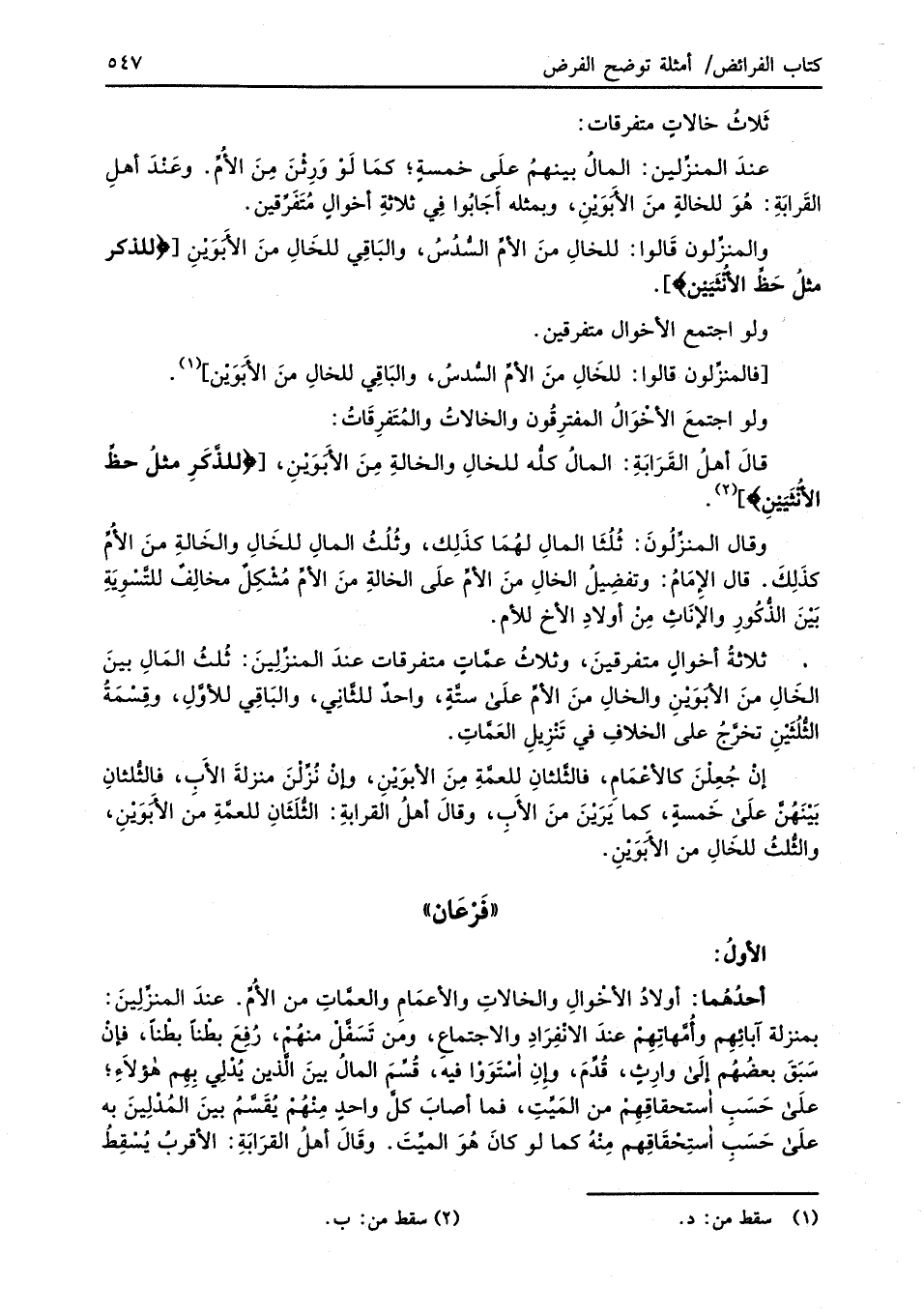 وقال المنزِّلُونَ: ثُلُثَا المالِ لهُما كذَلِك، وثُلُثُ المالِ للخَالِ والخَالةِ منَ الأُمِّ كذَلِكَ. قال الإمَامُ: وتفضِيلُ الخالِ منَ الأمِّ علَى الخالةِ منَ الأمِّ مُشْكِلٌ مخالِفٌ للتَّسْوِيَةِ بَيْنَ الذُّكُورِ والإنَاثِ من أولادِ الأخ للأم.
