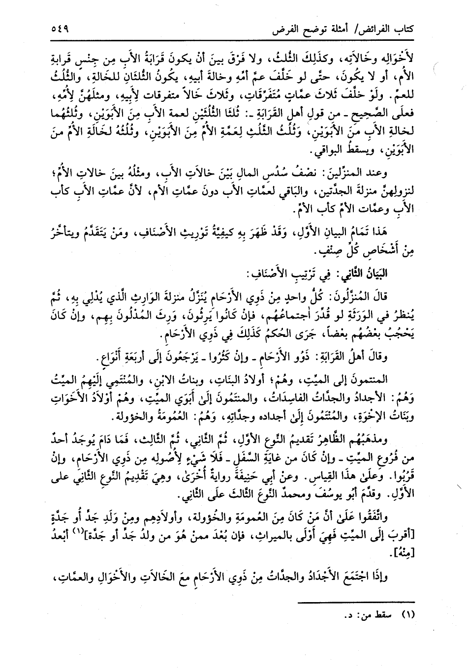 هَذا تَمَامُ البيانِ الأَوَّلِ، وَقَدْ ظَهَرَ بِهِ كيفِيَّةُ تَوْرِيثِ الأَصْنَافِ، ومَنْ يَتَقَدَّمُ ويتأخَّرُ مِنْ أَشْخَاصِ كُلِّ صِنْفٍ.