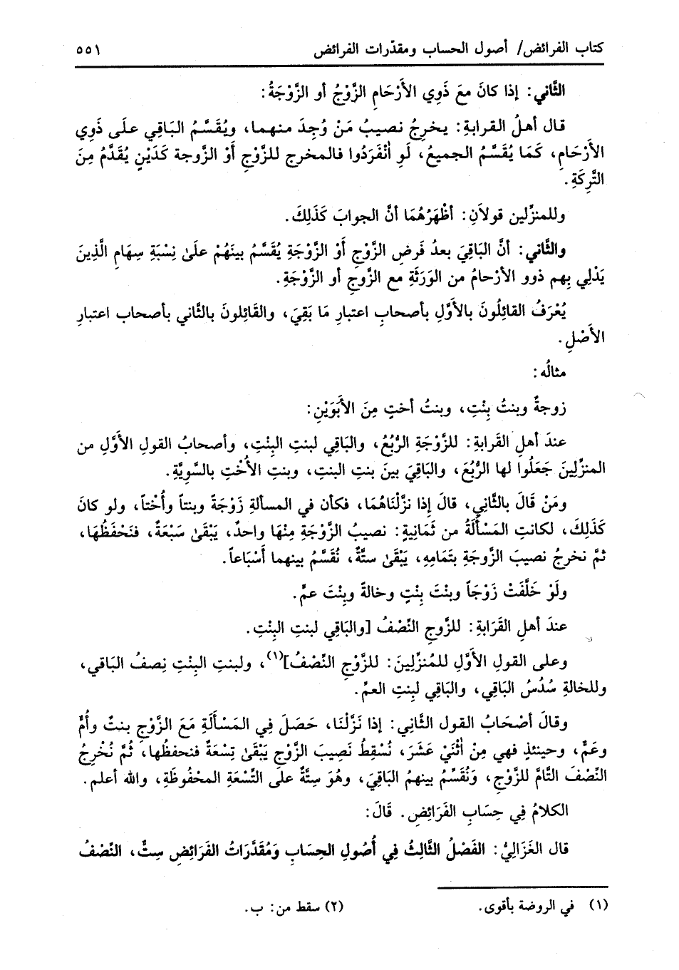 قال الغَزَالِيُّ: الفَصْلُ الثَّالِثُ فِي أُصُولِ الحِسَابِ وَمُقَدَّراتُ الفَرائِضِ سِتٌّ، النِّصْفُ