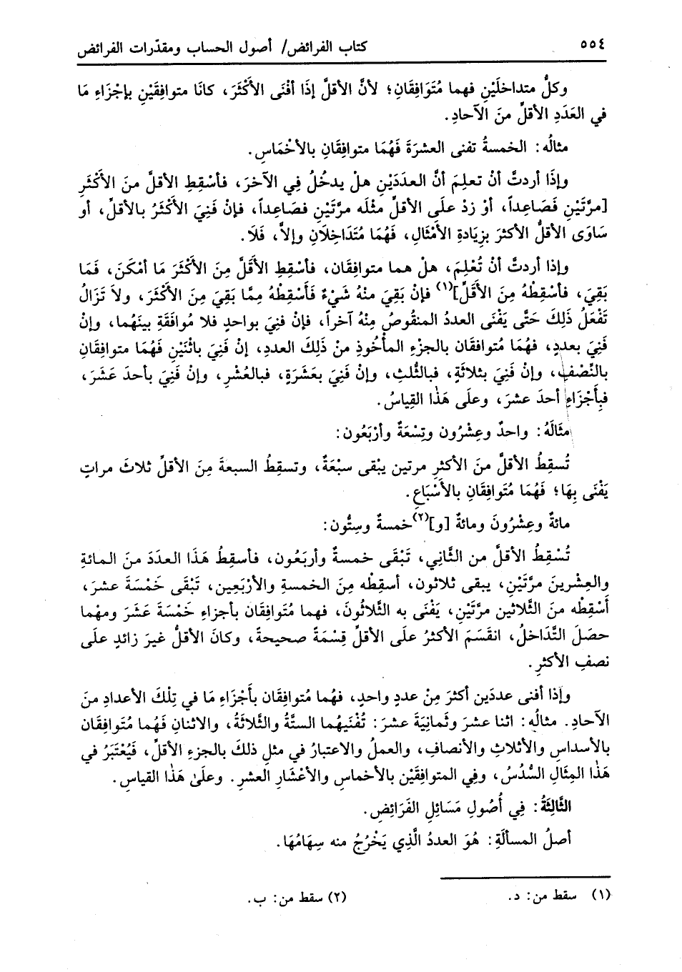 تُسْقِطُ الأقلَّ من الثَّانِي، تَبْقَى خمسةٌ وأربَعُون، فأسقِطُ هَذا العدَدَ منَ المائةِ والعِشْرينَ مرَّتَيْنِ، يبقى ثلاثون، أسقِطْه مِنَ الخمسةِ والأرْبَعِين، تَبْقَى خَمْسَةَ عَشَرَ، أَسْقِطْه منَ الثَّلاثين مرَّتَيْنِ، يَفْنَى به الثَّلاثُونَ، فهما مُتَوافِقان بأجزاءِ خَمْسَةَ عَشَرَ ومهْما حصَلَ التَّداخلُ، انقَسَمَ الأكثرُ علَى الأقلِّ قِسْمَةً صحيحةً، وكانَ الأقلُّ غيرَ زائدٍ علَى نصفِ الأكثرِ.