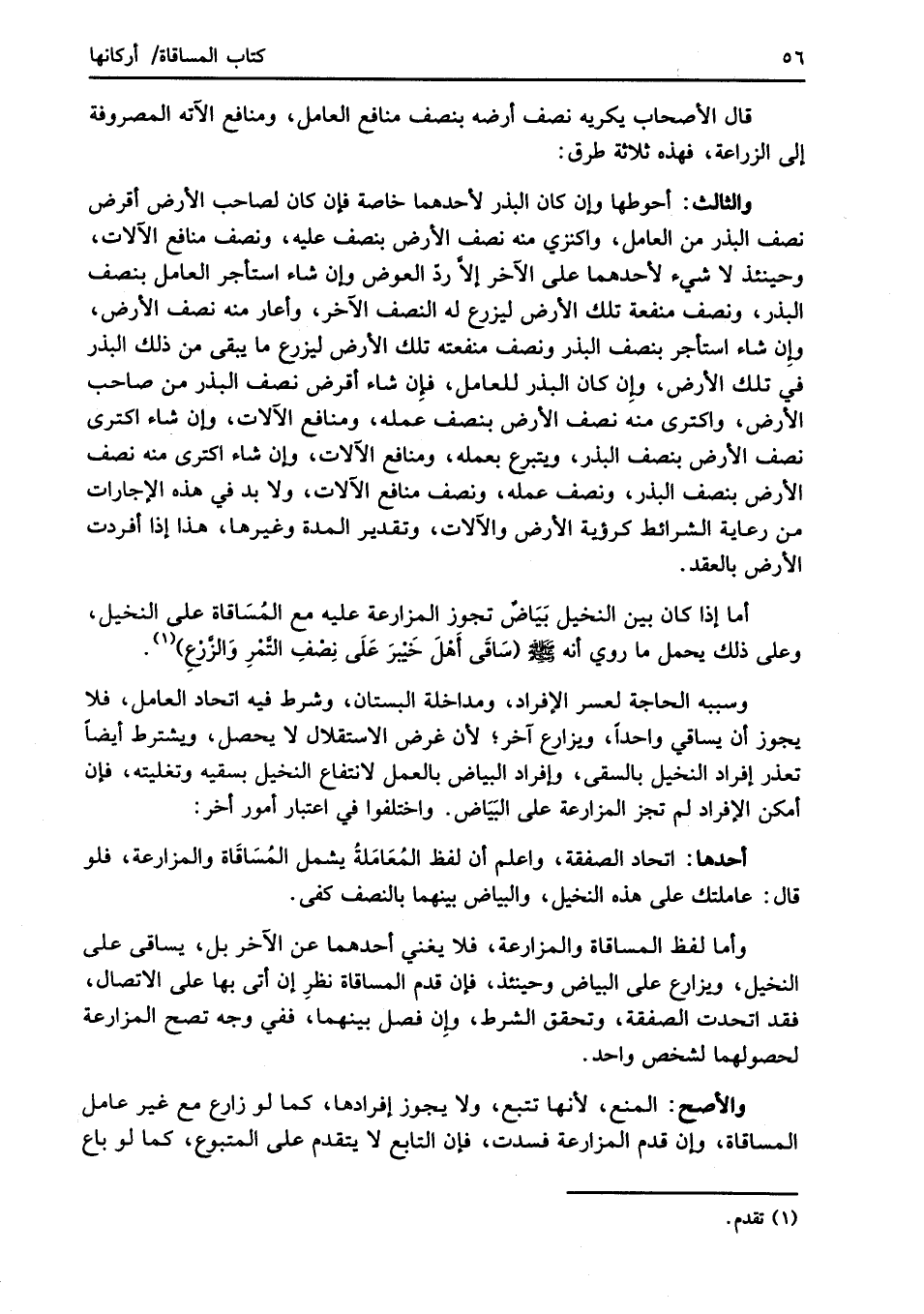 وسببه الحاجة لعسر الإفراد، ومداخلة البستان، وشرط فيه اتحاد العامل، فلا يجوز أن يساقي واحداً، ويزارع آخر؛ لأن غرض الاستقلال لا يحصل، ويثترط أيضاً تعذر إفراد النخيل بالسقى، وإفراد البياض بالعمل لانتفاع النخيل بسقيه وتغليته، فإن أمكن الإفراد لم تجز المزارعة على البَيَاض. واختلفوا في اعتبار أمور أخر:
