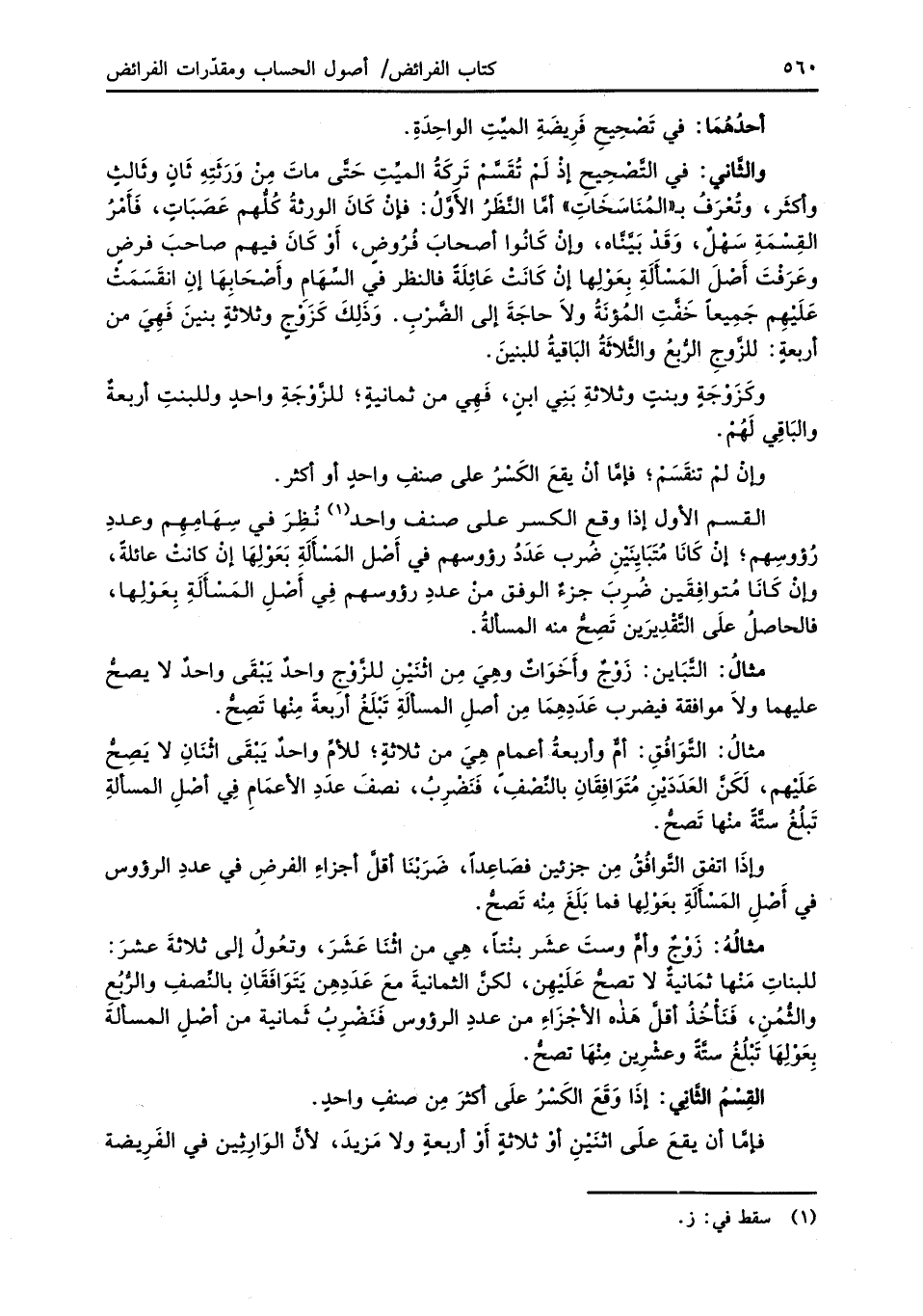 والثَّاني: في التَّصْحِيحِ إذْ لَمْ تُقَسَّم تَركَةُ الميِّتِ حَتَّى ماتَ مِنْ وَرَثَتِهِ ثَانٍ وثَالثٍ وأكثَر، وتُعرَفُ بـ"المُنَاسَخَاتِ" أمَّا النَّظَرُ الأَوَّلُ: فإنْ كَانَ الورثةُ كُلُّهم عَصَباتٍ، فأَمْرُ القِسْمَةِ سَهْلٌ، وَقَدْ بَيَّنَّاه، وإنْ كَانُوا أصحابَ فُرُوضٍ، أَوْ كَانَ فيهم صاحبَ فرضٍ وعَرَفْتَ أَصْلَ المَسْأَلَةِ بعَوْلِها إنْ كَانَتْ عائِلَةً فالنظر في السِّهَامِ وأَصْحَابِهَا إنِ انقَسَمَتْ عَلَيْهِم جَمِيعًا خَفَّتِ المُؤنَةُ ولاَ حاجَةَ إلى الضَّرْبِ. وَذَلِكَ كَزَوجٍ وثلاثةٍ بنينَ فَهِيَ من أربعةٍ: للزَّوجِ الرُّبعُ والثَّلاثَةُ البَاقيةُ للبنينَ.