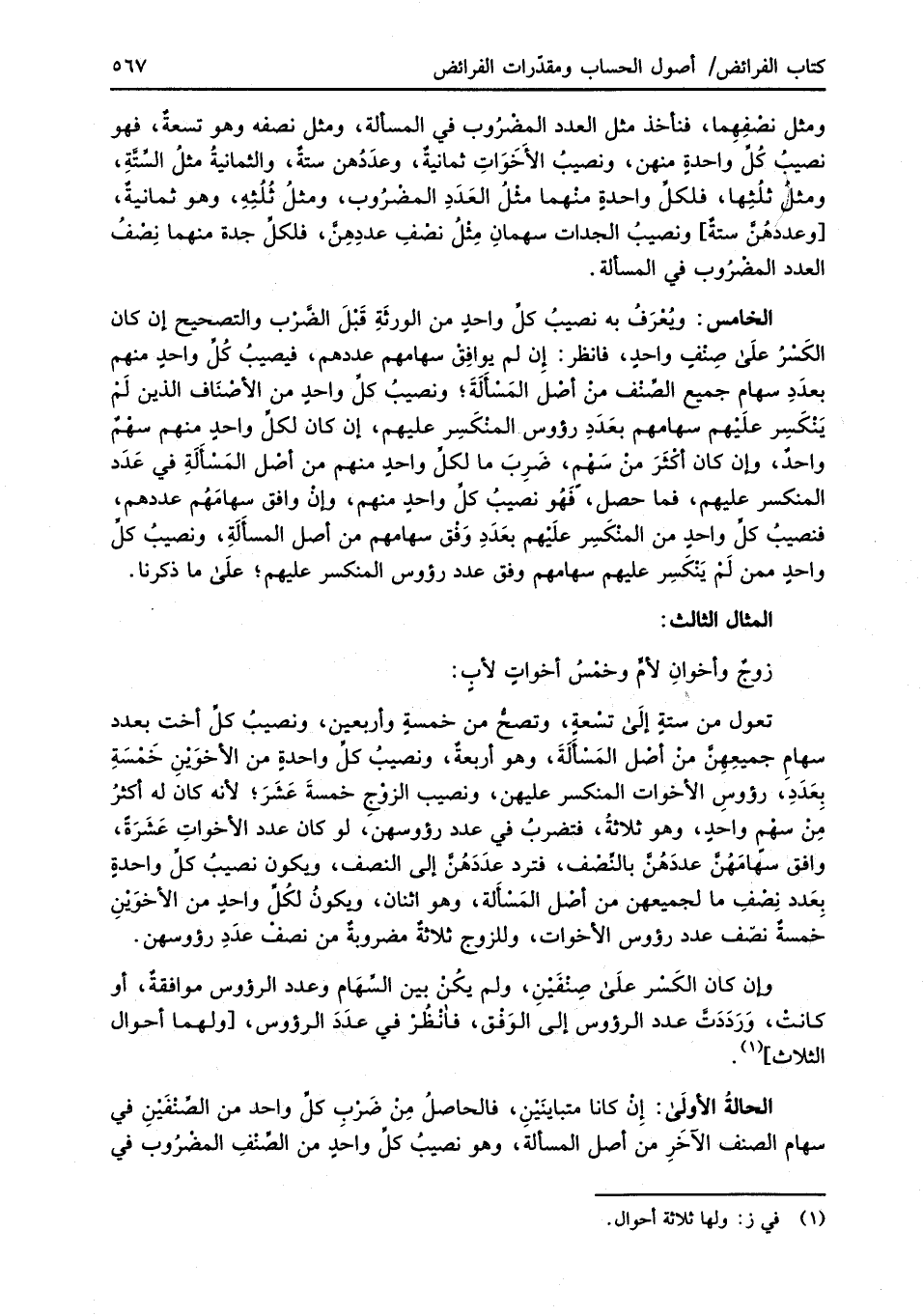 وإن كان الكَسْر عَلَى صِنْفَيْنِ، ولم يكُنْ بين السِّهَام وعدد الرؤوس موافقةٌ، أو كانتْ، وَرَدَدَتَّ عدد الرؤوس إلى الوَفْق، فانْظُرْ في عدَدَ الرؤوس، [ولهما أحوال الثلاث] (¬1).
