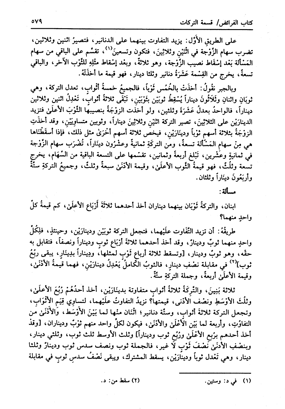 ثلاثة بَنِينَ، والتَّرِكَةُ ثلاثةُ أثوابٍ متفاوتة بدينَارَيْن، أخذ أحدُهُمْ رُبُعَ الأعلَى، وثلُثَ الأوْسَطِ ونصْف الأدْنى، قيمتها؟ نزيدُ التفاوتُ علَيْهما، لتساوِي قِيَمِ الأثْوَابِ، وتجعل التركة ثلاثةَ أثوابٍ، وستَّة دنانير؛ اثْنَان منْها لما بَيْنَ الأَوْسَط، والأَدْنَى من التفاوُتِ، وأربعة لما بَيْن الَأعْلَى والأدْنَى، فيكون لكلِّ واحد منهم ثوْبٌ وديناران، [وقدْ أخذ أحدهم برُبعِ الأعْلَى ورُبُع ثوب وديناراً] وثلث الأوسط ثلث ثوب، وثلثي دينار، وبنصْفِ الأدنَى نصْفَ ثَوْبٍ لَا غير، فالجملة ثوب ونصف سدس ثوب ودينارٌ وثلثا دينار، وهي تَعْدل ثوباً ودينارَيْن، يسقط المشترك، ويبقى نَصْفُ سدسِ ثوبٍ في مقابلة