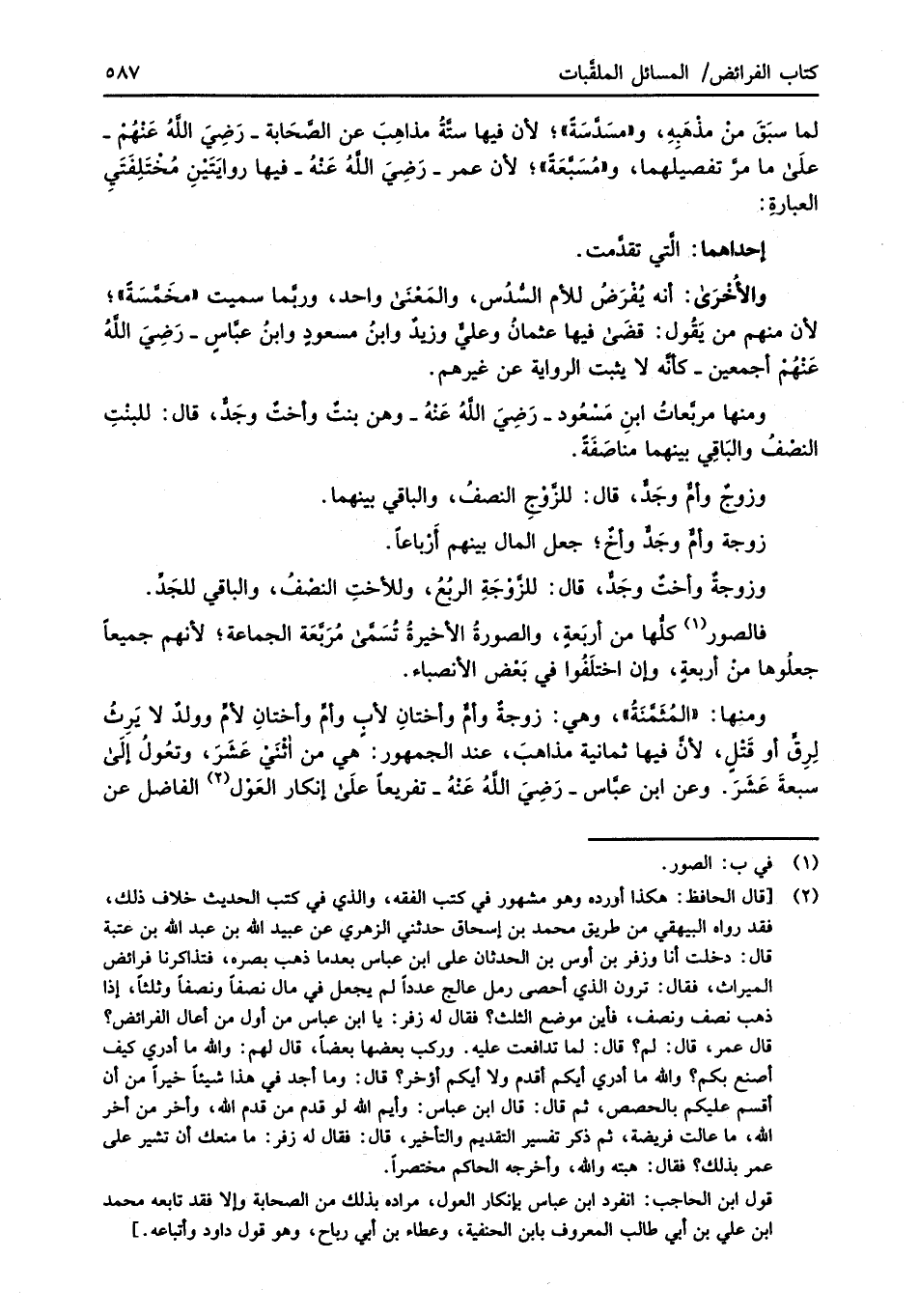 (¬2) [قال الحافظ: هكذا أورده وهو مشهور في كتب الفقه، والذي في كتب الحديث خلاف ذلك، فقد رواه البيهقي من طريق محمد بن إسحاق حدثني الزهري عن عبيد الله بن عبد الله بن عتبة قال: دخلت أنا وزفر بن أوس بن الحدثان على ابن عباس بعد ما ذهب بصره، فتذاكرنا فرائض الميراث، فقال: ترون الذي أحصى رمل عالج عدداً لم يجعل في مال نصفاً ونصفاً وثلثاً، إذا ذهب نصف ونصف، فأين موضع الثلث؟ فقال له زفر: يا ابن عباس من أول من أعال الفرائض؟ قال عمر، قال: لم؟ قال: لما تدافعت عليه. وركب بعضها بعضاً، قال لهم: والله ما أدري كيف أصنع بكم؟ والله ما أدري أيكم أقدم ولا أيكم أؤخر؟ قال: وما أجد في هذا شيئاً خيراً من أن أقسم عليكم بالحصص، ثم قال: قال ابن عباس: وأيم الله لو قدم من قدم الله، وأخر من أخر الله، ما عالت فريضة، ثم ذكر تفسير التقديم والتأخير، قال: فقال له زفر: ما منعك أن تشير على عمر بذلك؟ فقال: هبته والله، وأخرجه الحاكم مختصراً.