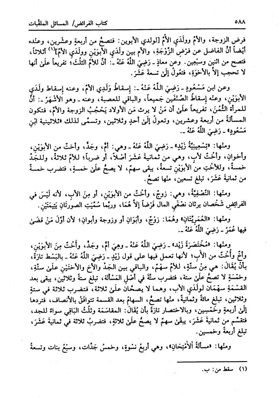 ومنْها: "مُخْتَصَرَةُ زَيد" -رَضِيَ اللَّهُ عَنْهُ- وهِيَ أمٌّ، وجَدٌّ، وأَخْتٌ مِنَ الأبوَيْنِ، وأخٌ وأُخْتٌ من الأَبِ؛ لأنها تعمل فيها على قول زَيْدٍ -رَضِيَ اللَّهُ عَنْهُ- بالبَسْط تارَةً، بأنْ يُقَالَ: هي مِنْ ستَّةٍ، للأمِّ سهْمٌ، والباقي بين الجَدِّ والأخ والأختَيْنِ علَى ستَّةِ، وخمْسَةٍ لا تصحُّ عَلَى ستة، فتضرب ستَّةَ في أصْلِ المَسْألة، تبلغ ستةً وثلاثين، يبقى بعد القسْمَةِ سهْمَان لولَدَي الأب، وهما لا يصحَّان علَى ثلاثة، فتضرب ثلاثة في ستةٍ وثلاثين، تبلغِ مائةً وثمَانيةً، منها تصحُّ، السهامُ بعد القسمة تتوافَقُ بالأنصاف، فتردها إلَى أربعةٍ وخمْسِين، وبالاختصار تارَةً بأن يُقَالَ: المقاسَمَة وثلُثُ البَاقِي سواءٌ للجد، فتقسَّم من ثمانيةَ عَشَرَ، يبقَى سهمٌ لا يصحُّ علَى ثلاثةِ، فتضربُ ثلاثة في ثمانيةَ عَشَرَ، تبلغ أربعةً وخمسين.