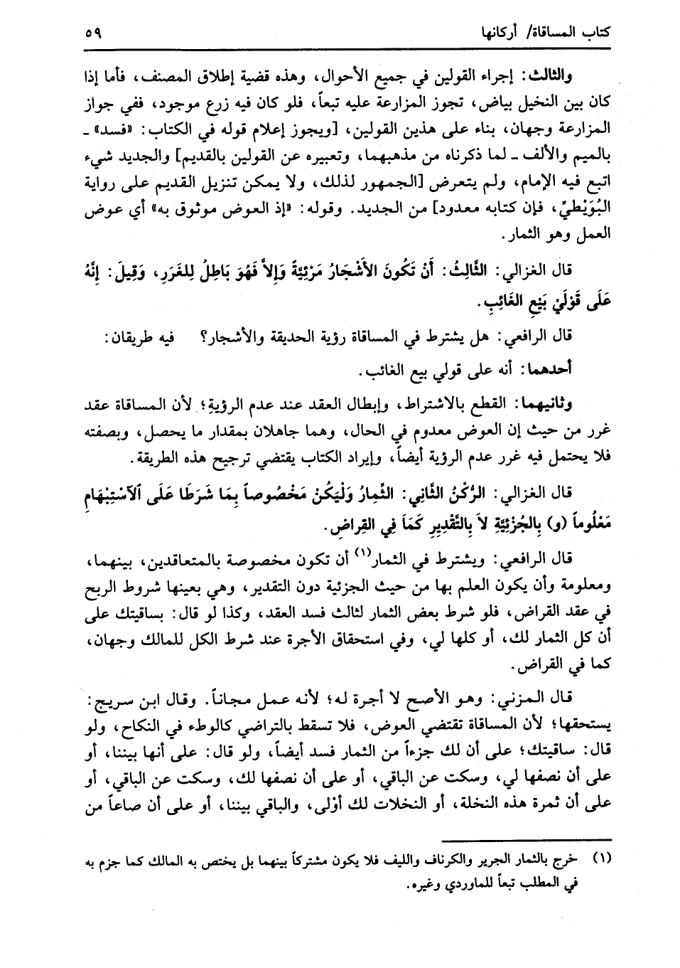 قال الغزالي: الرُّكْنُ الثَّانِي: الثِّمِارُ وَلْيَكُنْ مَخْصُوصاً بِمَا شَرَطَا عَلَى الاسْتِبْهَامِ مَعْلُوماً (و) بِالجُزْئِيَّةِ لاَ بِالتَّقْدِيِرِ كَمَاَ فِي القِراضِ.