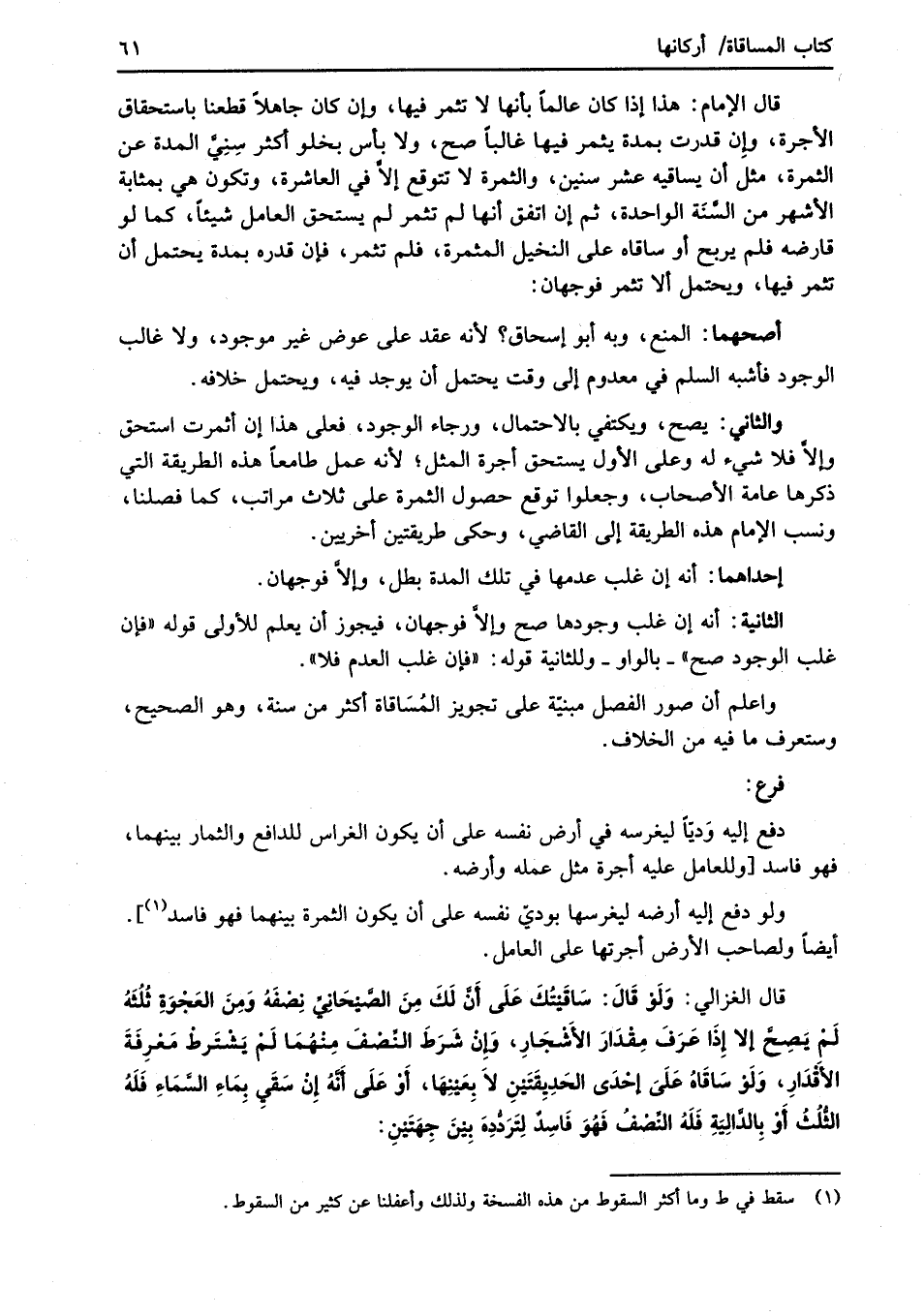 قال الغزالي: وَلَوْ قَالَ: سَاقَيْتُكَ عَلَى أَنَّ لَكَ مِنَ الصَّيْحَانِىِّ نِصْفَهُ وَمِنَ العَجْوَةِ ثُلُثَهُ لَمْ يَصِحَّ إلا إِذَا عَرَفَ مِقْدَارَ الأَشْجَارِ، وَإِنْ شَرَطَ النِّصْفَ مِنْهُمَا لَمْ يَشْتَرطْ مَعْرِفَةَ الأَقْدَارِ، وَلَوْ سَاقَاهُ عَلَىَ إحْدَى الحَدِيِقَتَيْنِ لاَ يِعَيْنِهَا، أَوْ عَلَى أَنَّهُ إِنْ سَقَيِ بِمَاءِ السَّمَاءِ فَلَهُ الثُّلُثُ أَوْ بِالدَّالِيَةِ فَلَهُ النَّصْفُ فَهُوَ فَاسِدٌ لِتَرَدُّدِهَ بِيْنَ جِهَتَيْنِ: