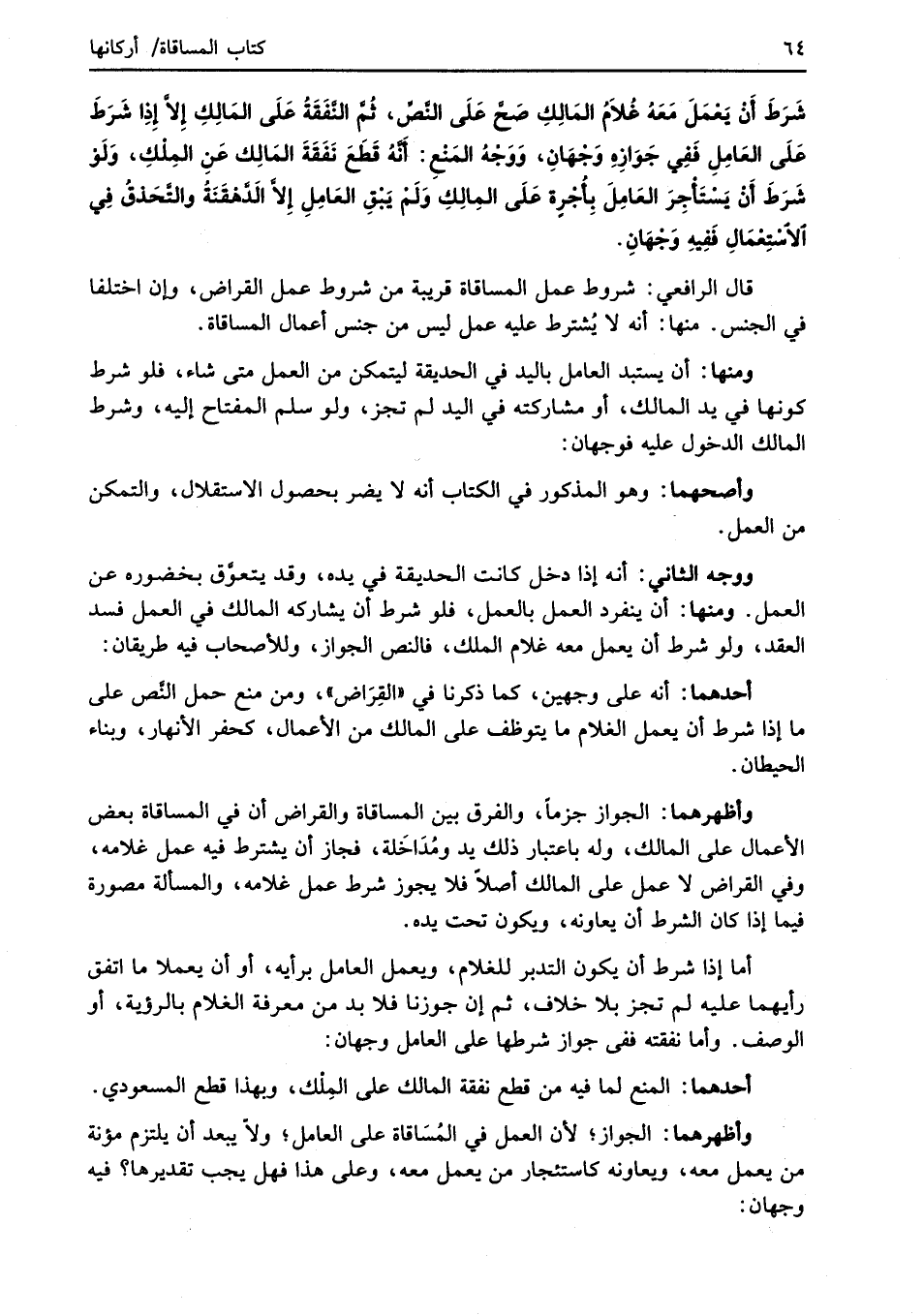 ووجه الثاني: أنه إذا دخل كانت الحديقة في يده، وقد يتعوَّق بحضوره عن العمل. ومنها: أن ينفرد العمل بالعمل، فلو شرط أن يشاركه المالك في العمل فسد العقد، ولو شرط أن يعمل معه غلام الملك، فالنص الجواز، وللأصحاب فيه طريقان:
