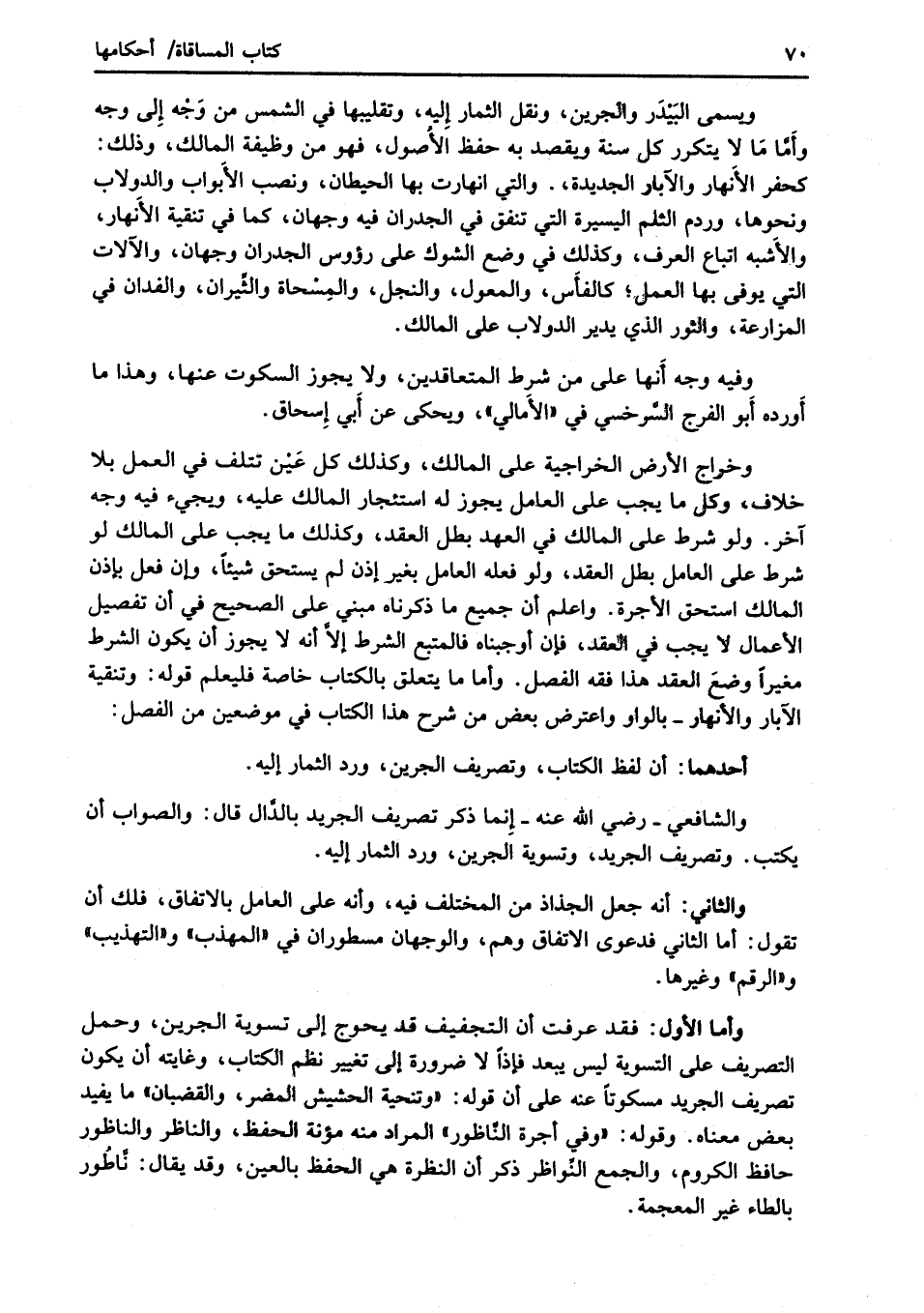 وأما الأول: فقد عرفت أن التجفيف قد يحوج إلى تسوية الجرين، وحمل التصريف على التسوية ليس يبعد فإذًا لا ضرورة إلى تغيير نظم الكتاب، وغايته أن يكون تصريف الجريد مسكوتاً عنه على أن قوله: "وتنحية الحشيش المضر، والقضبان" ما يفيد بعض معناه. وقوله: "وفي أجرة النَّاظور" المواد منه مؤنة الحفظ، والناظر والناظور حافظ الكروم، والجمع النّواظر ذكر أن النظرة هي الحفظ بالعين، وقد يقال: نَّاطُور بالطاء غير المعجمة.
