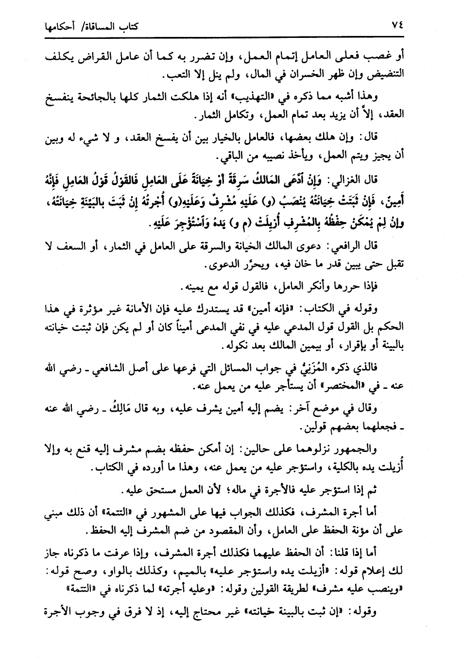 قال الغزالي: وَإِنْ ادَّعَى المَالكُ سَرِقَةً أَوْ خِيَانَةً عَلَى العَامِلِ فَالقَوْلُ قَوْلُ العَامِلِ فَإِنَّهُ أَمِينٌ، فَإِنْ ثَبَتَتْ خِيَانَتُهُ يُنْصَبُ (و) عَلَيْهِ مُشْرِفٌ وَعَلَيْهِ (و) أُجْرتُهُ إِنْ ثَبَتَ بالبَيِّنَةِ خِيَانَتُهُ، وإنْ لِمْ يُمْكَنْ حِفْظُهُ بِالمُشْرِفِ أُزيِلَتْ (م و) يَدهُ وَاسْتُؤْجِرَ عَلَيْهِ.