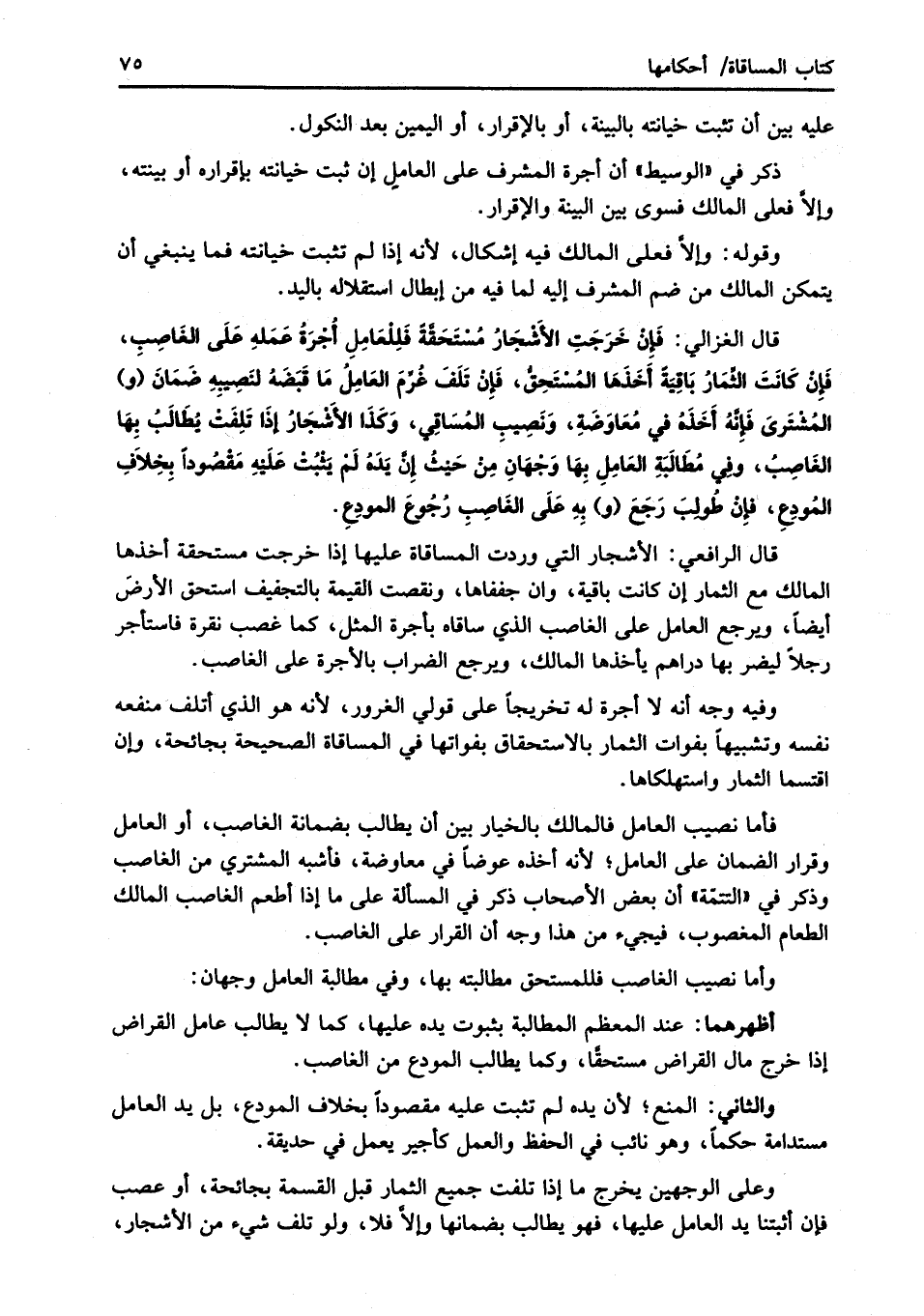 قال الغزالي: فَإِنْ خَرَجَت الأَشْجَارُ مُسْتَحَقَّةَ فَلِلْعَامِلِ أُجْرَةُ عَمَلهِ عَلَى الغَاصِبِ، فَإِنْ كَانَتَ الثِّمَارُ بَاقِيَةً أَخَذَهَا المُسْتَحِقُّ، فَإِنْ تَلَفَ غُرِّمَ العَامِلُ مَا قبَضَهُ لنَصِيبهِ ضمَانَ (و) المُشْتَرىَ فَإنَّهُ أَخَذَهُ في مُعَاوَضَةِ، وَنَصِيبِ المُسَاقِي، وَكذَا الأَشْجَارُ إِذَا تَلِفَتْ يُطَالَبُ بِهَا الغَاصِبُ، وفي مُطالَبَةِ العَامِلِ بِهَا وَجْهَانِ مِنْ حَيْثُ إِنَّ يَدَهُ لَمْ يَثبُتْ عَلَيْهِ مَقْصُوداً بِخِلاَفِ المُودِعِ، فإِنْ طُولِبَ رَجَعَ (و) بِهِ عَلَى الغَاصِبِ رُجُوعَ المودِعِ.