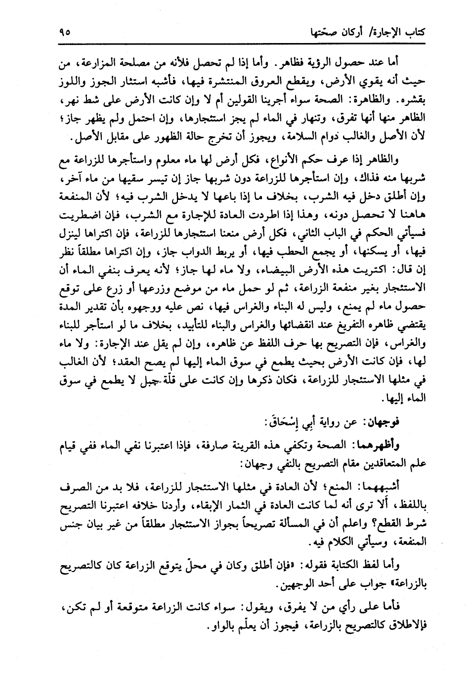 والظاهر إذا عرف حكم الأنواع، فكل أرض لها ماء معلوم واستأجرها للزراعة مع شربها منه فذاك، وإن استأجرها للزراعة دون شربها جاز إن تيسر سقيها من ماء آخر، وإن أطلق دخل فيه الشرب، بخلاف ما إذا باعها لا يدخل الشرب فيه؛ لأن المنفعة هاهنا لا تحصل دونه، وهذا إذا اطردت العادة للإجارة مع الشرب، فإن اضطريت فسيأتي الحكم في الباب الثاني، فكل أرض منعنا استئجارها للزراعة، فإن اكتراها لينزل فيها، أو يسكنها، أو يجمع الحطب فيها، أو يربط الدواب جاز، وإن اكتراها مطلقاً نظر إن قال: اكتريت هذه الأرض البيضاء، ولا ماء لها جاز؛ لأنه يعرف بنفي الماء أن الاستئجار بغير منفعة الزراعة، ثم لو حمل ماء من موضع وزرعها أو زرع على توقع حصول ماء لم يمنع، وليس له البناء والغراس فيها، نص عليه ووجهوه بأن تقدير المدة يقتضي ظاهره التفريغ عند إنقضائها والغراس والبناء للتأبيد، بخلاف ما لو استأجر للبناء والغراس، فإن التصريح بها حرف اللفظ عن ظاهره، وإن لم يقل عند الإجارة: ولا ماء لها، فإن كانت الأرض بحيث يطمع في سوق الماء إليها لم يصح العقد؛ لأن الغالب في مثلها الاستئجار للزراعة، فكان ذكرها وإن كانت على قلّة جبل لا يطمع في سوق الماء إليها.