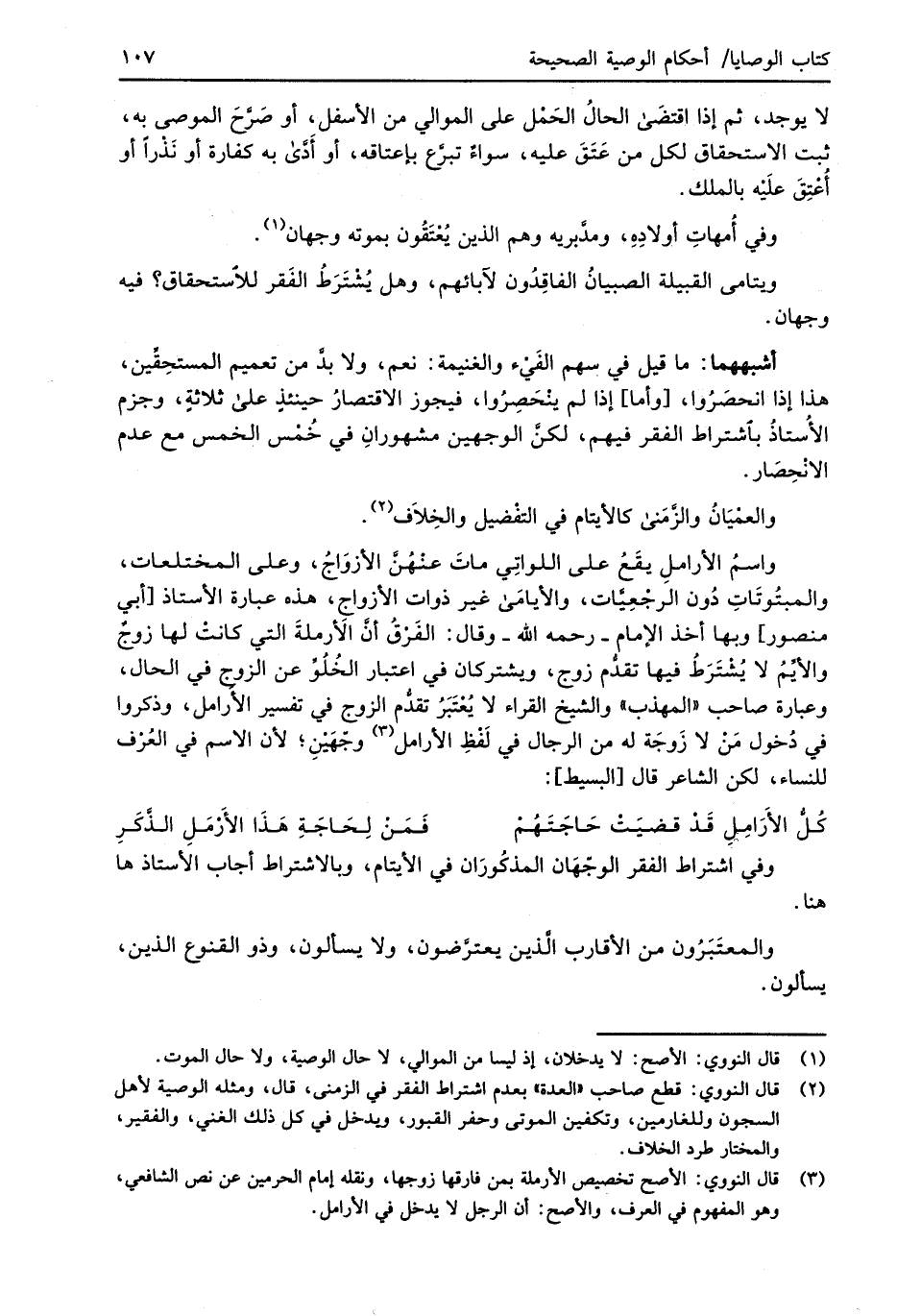 (¬2) قال النووي: قطع صاحب "العدة" بعدم اشتراط الفقر في الزمنى، قال، ومثله الوصية لأهل السجون وللغارمين، وتكفين الموتى وحفر القبور، ويدخل في كل ذلك الغني، والفقير، والمختار طرد الخلاف.