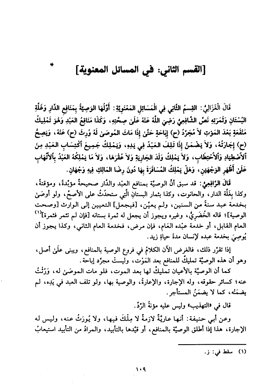 قَالَ الْغَزَالِيُّ: القِسمُ الثَّانِي في الْمَسَائِلِ المَعْنَوِيَّةِ: أَوَّلُهَا الوَصِيَّةُ بِمَنَافِعِ الدَّارِ وَغَلَّةِ البُسْتَانِ وَثَمَرَتِهِ نَصَّ الشافِعِيُّ -رضي الله عنه- عَلَى صِحَّتِهِ، وَكَذَا مَنَافِعُ العَبْدِ وَهُوَ تَمْلِيكُ مَنْفَعَةِ بَعْدَ المَوتِ لاَ مُجَرَّدُ (ح) إِبَاحَةٍ حَتَّى إِذَا مَاتَ المُوصَى لَهُ وُرِثَ (ح) عَنْهُ، وَيصِحُّ (ح) إِجَارَتُهُ، وَلاَ يَضْمَنُ إِذَا تَلِفَ العَبْدُ في يَدِهِ، وَيَمْلِكُ جَمِيعَ اكْتِسَابِ العَبْدِ مِنَ الاصْطِيَادِ وَالاختِطَابِ، ولا يَمْلِكُ وَلَدَ الجَارِيةِ وَلاَ عُقْرَهَا، وَلاَ مَا يَمْلِكُهُ العَبْدُ بِالاتِّهَابِ عَلَى أَظْهَرِ الوَجْهَيْنِ، وَهَل يَمْلِكُ المُسَافَرَةَ بِهَا دُونَ رِضَا المَالِكِ فِيهِ وَجْهَانِ.