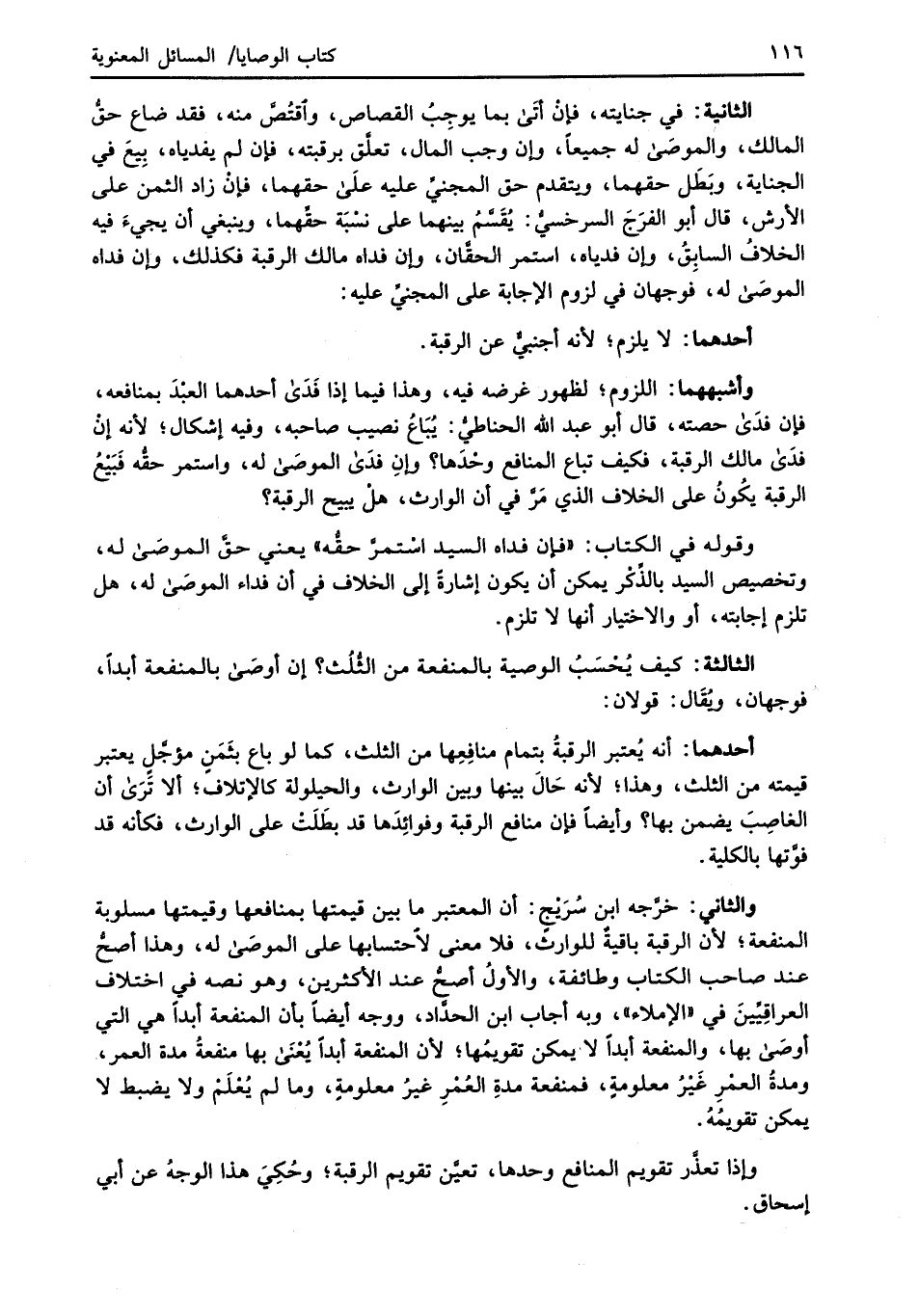 الثانية: في جنايته، فإنْ أتَى بما يوجِبُ القصاص، واقتُصَّ منه، فقد ضاع حقُّ المالك، والموصَى له جميعاً، وإن وجب المال، تعلَّق برقبته، فإن لم يفدياه، بِيعَ في الجناية، وبَطَل حقهما، ويتقدم حق المجنيِّ عليه علَى حقهما، فإنْ زاد الثمن على الأرش، قال أبو الفرَجَ السرخسيُّ: يُقَسَّمُ بينهما على نسْبَة حقِّهما، وينبغي أن يجيءَ فيه الخلافُ السابِقُ، وإن فدياه، استمر الحقَّان، وإن فداه مالك الرقبة فكذلك، وإن فداه الموصَى له، فوجهان في لزوم الإجابة على المجنيِّ عليه: