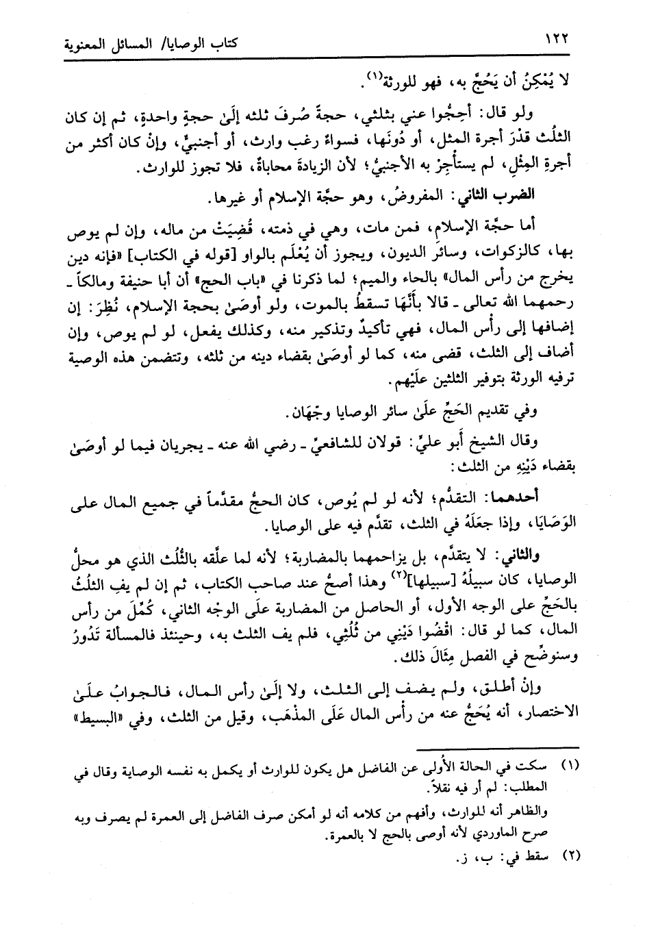 أما حجَّة الإِسلامِ، فمن مات، وهي في ذمته، قُضِيَتْ من ماله، وإن لم يوص بها، كالزكوات، وسائر الديون، ويجوز أن يُعْلَم بالواو [قوله في الكتاب] "فإنه دين يخرج منْ رأس المال" بالحاء والميم؛ لما ذكرنا في "باب الحج" أن أبا حنيفة ومالكاً -رحمهما الله تعالى- قالا بأنَّهَا تسقطُ بالموت، ولو أوصَى بحجة الإِسلام، نُظِرَ: إن إضافها إلى رأس المال، فهي تأكيدٌ وتذكير منه، وكذلك يفعل، لو لم يوص، وإن أضاف إلى الثلث، قضى منه، كما لو أوصَى بقضاء دينه منْ ثلثه، وتتضمن هذه الوصية ترفيه الورثة بتوفير الثلثين علَيْهم.