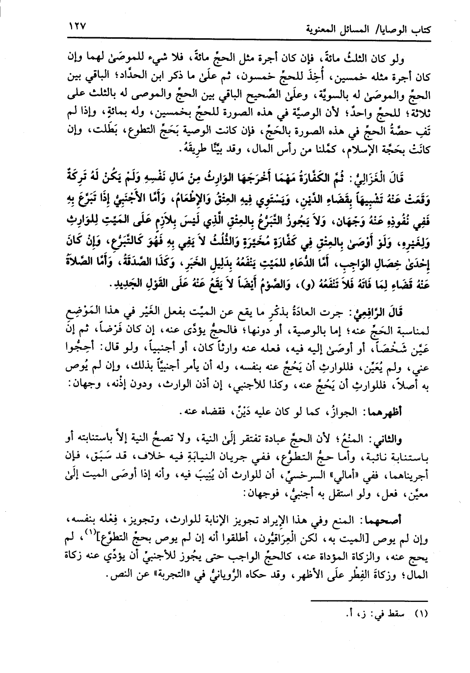 قَالَ الرَّافِعِيُّ: جرت العادَة بذكرِ ما يقع عن الميِّت بفعل الغَيْر في هذا المَوْضِعِ لمناسبة الحَجِّ عنه؛ إما بالوصية، أو دونها؛ فالحجُّ يؤدى عنه، إن كان فَرْضاً، ثم إن عَيَّن شَخْصًا، أو أوصَى إليه فيه، فعله عنه وارثًا كان، أو أجنبياً، ولو قال: أحِجُّوا عني، ولم يُعَيِّن، فللوارثِ أن يَحُجَّ عنه بنفسه، وله أن يأمر أجنبيَّاً بذلك، وإن لم يُوص به أصلاً، فللوارثِ أن يَحُجَّ عنه، وكذا للأجنبي، إن أذن الوارث، ودون إذْنه، وجهان: