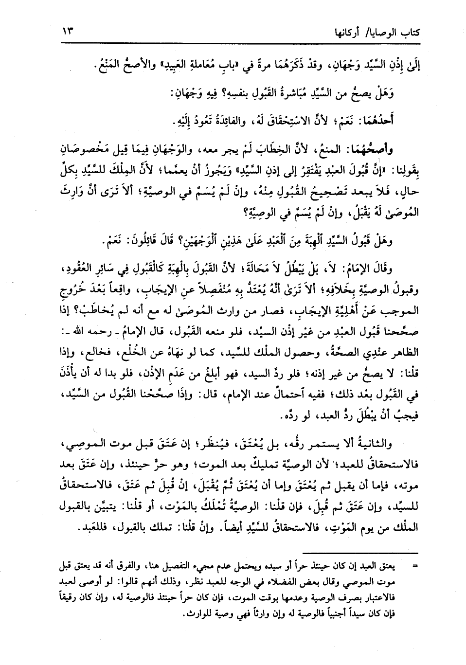 وقَالَ الإمَامُ: لاَ، بَلْ يَبْطُلُ لاَ مَحَالَةَ؛ لأنَّ القَبُولَ بِالْهِبَةِ كَالْقَبُولِ فِي سَائِرِ العُقُودِ، وقبولُ الوصيَّةِ بِخَلاَفِهِ؛ ألاَ تَرَى أنَّهُ يُعْتَدُّ بِهِ مُنْفَصِلاً عنِ الإيجَاب، واقِعاً بَعْدَ خُرُوجِ الموجب عَنْ أَهْلِيَّةِ الإيجَابِ، فصار من وارث المُوصَى له مع أنه لم يُخاطَبْ؟ إذا صحَّحنا قَبُول العبْدِ من غير إذْن السيِّد، فلو منعه القَبُول، قال الإمامُ -رحمه الله-: الظاهر عنْدِي الصحَّةُ، وحصول الملْك للسَّيد، كما لو نهَاهُ عن الخُلْع، فخالع، وإذا قلْنا: لا يصحُّ من غير إذنه؛ فلو ردَّ السيد، فهو أبلغُ من عَدَمِ الإذْن، فلو بدا له أن يأْذَنَ في القَبُول بعْد ذلك؛ ففيه احتمالٌ عند الإمام، قال: وإذَا صحَّحْنا القُبُول من السَّيِّد، فيجبُ أنْ يبْطُلَ ردُّ العبد، لو ردَّه.