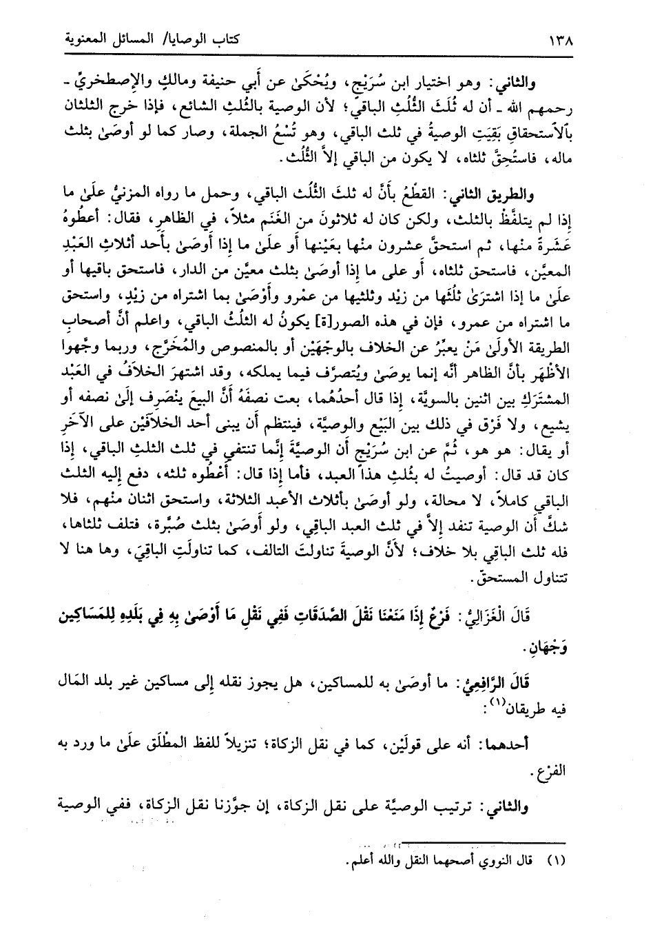 قَالَ الرَّافِعِيُّ: ما أوصَى به للمساكين، هل يجوز نقله إِلى مساكين غير بلد المَال فيه طريقان (¬1):