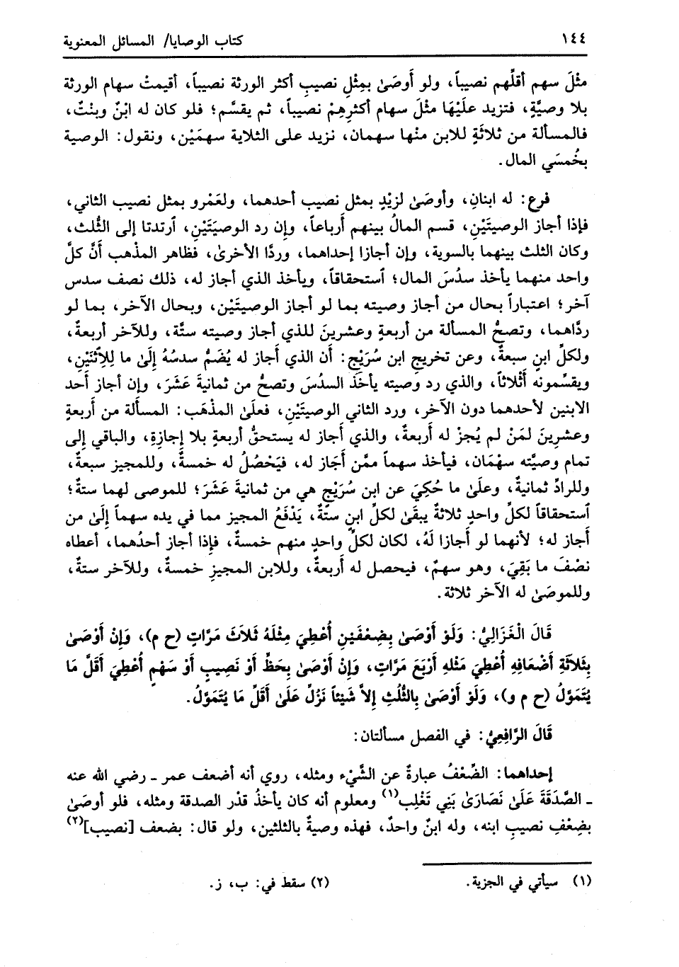 فرع: له ابنانِ، وأوصَى لزيْدٍ بمثل نصيب أحدهما؛ ولعَمرو بمثل نصيب الثاني، فإذا أجاز الوصيتَيْنِ، قسم المالُ بينهم أَرباعًا، وإن رد الوصيَتَيْنِ، ارتدتا إلى الثُّلث، وكان الثلث بينهما بالسوية، وإن أجازا إحداهما، وردّا الأخرى، فظاهر المذْهب أَنَّ كلَّ واحد منهما يأخذ سدُسَ المال؛ استحقاقًا، ويأخذ الذي أجاز له، ذلك نصف سدس آخر؛ اعتباراً بحال من أجاز وصيته بما لو أجاز الوصيتَيْن، وبحال الآخر، بما لو ردَّاهما، وتصحُّ المسألة من أربعةٍ وعشرينَ للذي أجاز وصيته ستَّة، وللآخر أربعةٌ، ولكلِّ ابنٍ سبعةٌ، وعن تخريجِ ابن سُرَيْج: أَن الذي أَجاز له يُضَمُّ سدسُهُ إلى ما لِلِاثنَينِ، ويقسمونه أَثْلاثًا، والذي رد وصيته يأخذ السدُسَ وتصحُّ من ثمانيةَ عَشَرَ، وإن أجاز أَحد الابنين لأحدهما دون الآخر، ورد الثاني الوصيتَيْنِ، فعلَى المذْهَب: المساَلة من أَربعةٍ وعشرِينَ لمَنْ لم يُجزْ له أَربعةٌ، والذي أَجاز له يستحقُّ أربعةٍ بلا إجازِةِ، والباقي إِلى تمام وصيَّته سهْمَان، فيأخذ سهماً ممَّن أَجَاز له، فيَحْصُلُ له خمسةٌ، وللمجيز سبعةٌ، وللرادِّ ثمانيةٌ، وعلَى ما حُكِيَ عن ابن سُرَيْجٍ هي من ثمانيةَ عَشَرَ؛ للموصى لهما ستةٌ؛ استحقاقًا لكلِّ واحدٍ ثلاثةٌ يبقَى لكلِّ ابنٍ ستةٌ، يَدْفَعُ المجيز مما في يده سهماً إلَى من أَجاز له؛ لأنهما لو أَجازا لَهُ، لكان لكلِّ واحدٍ منهم خمسةٌ، فإذا أجاز أحدُهما، أعطاه نصْفَ ما بَقِيَ، وهو سهمٌ، فيحصل له أَربعةٌ، وللابن المجيزِ خمسةٌ، وللآخر ستةٌ، وللموصَى له الآخر ثلاثة.