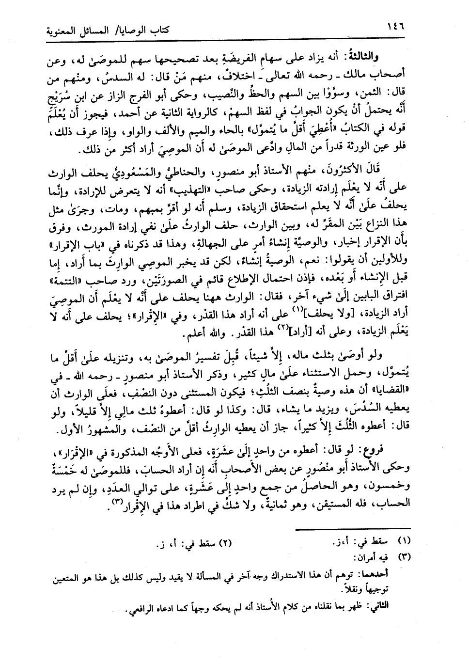 والثالثةُ: أنه يزاد على سهام الفريضَةِ بعد تصحيحها سهم للموصَى له، وعن أصحاب مالك -رحمه الله تعالى- اختلافٌ، منهم من قال: له السدسُ، ومنْهم من قال: الثمن، وسوَّوْا بين السهم والحظِّ والنَّصيب، وحكى أبو الفرج الزاز عن ابن سُرَيْجٍ أَنَّه يحتملُ أنْ يكون الجوابُ في لفظ السهمْ، كالرواية الثانية عن أحمد، فيجوز أَن يُعْلَمَ قوله في الكتابُ "أُعْطِيَ أَقلَّ ما يُتموَّل" بالحاء والميم والألف والواو، وإِذا عرف ذلك، فلو عين الورثة قدرًا من المالِ وادَّعى الموصَى له أَن الموصِيَ أراد أكثر من ذلك.