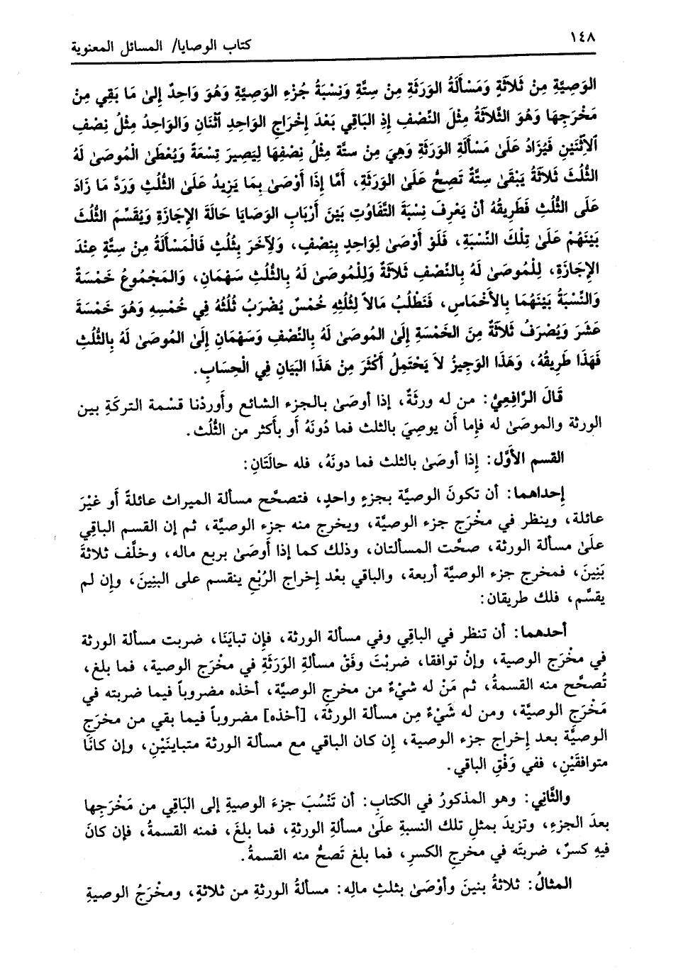 قَالَ الرَّافِعِيُّ: من له ورثَةٌ، إذا أوصَى بالجزء الشائع وأَوردْنا قسْمة التركَةِ بين الورثة والموصَى له فإِما أَن يوصِيَ بالثلث فما دُونَهُ أَو بأَكثر من الثُّلُث.