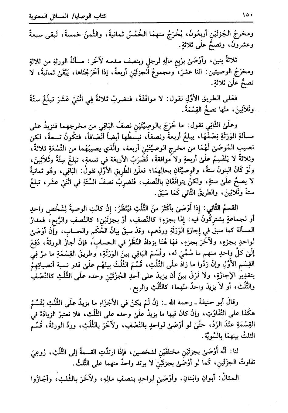 وعلَى الثَّانِي نقول: ما خَرَجَ بالوصِيَّتَيْنِ نصفُ البَاقِي من مخرجهما فنزيدُ على مسألةِ الوَرَثَةِ نِصْفَهَا، يبلغُ أربعةً ونصفاً، نبسطُها أيضاً أنْصَافًا، فتكونُ تسعةً، لكن نصيب المُوصَى لَهُمَا من مخرجِ الوصيَّتَيْنِ أربعة، والَّذي يصيبُهُما من التِّسْعَةِ ثلاثةٌ، وثلاثةٌ لا يَنْقَسِمُ عَلَى أربعةٍ ولا موافقةَ، تُضْرَبُ الأربعَة في تسعةٍ، تبلغُ سِتَّةَ وثَلاَثِينَ، ولَو كَانَ البنونَ ستةً، والوِصيَّتَانِ بحالِهِمَا؛ فعلَى الطَّرِيقِ الأوَّلِ نقولُ: البَاقِي، وهُو ثمانيةٌ لا يصحُّ عَلَى ستةٍ، ولكنْ يتوافَقَانِ بالنِّصفِ، فَنَضرِبُ نصفَ السِّتَةِ في اثْنَيْ عشَر، تبلغُ ستةً وثَلاثينَ، والطريقُ الثَّاني كَمَا سَبَقَ.