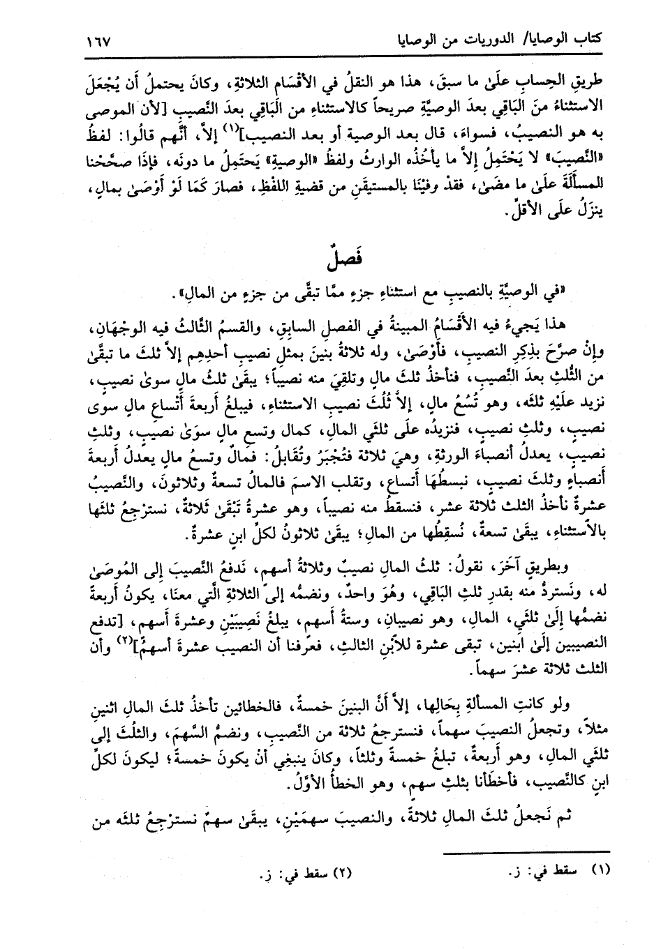 هذا يَجيءُ فيه الأَقْسَامُ المبينةُ في الفصلِ السابِقِ، والقسمُ الثَّالثُ فيه الوجْهَانِ، وإنْ صرَّحَ بذِكِرِ النصيب، فأوْصَى، وله ثلاثةُ بنينَ بمثلِ نصيبِ أحدِهِم إلاَّ ثلثَ ما تبقَّى من الثُّلثِ بعدَ النَّصيبِ، فنأخذُ ثلثَ مالٍ وتلقِيَ منه نصيبًا؛ يبقَى ثلثُ مالٍ سوى نصيبٍ، نزيد علَيْهِ ثلثَه، وهو تُسُعُ مالٍ، إلاَّ ثُلُثَ نصيبِ الاستثناءِ، فيبلغُ أَربعةَ أَتْساعِ مالٍ سوى نصيبٍ، وثلثَ نصيبٍ، فنزيدُه علَى ثلثَي المالَ، كمال وتسعِ مالٍ سوَى نصيبٍ، وثلثِ نصيبٍ، يعدلُ أنصباَءَ الورثةِ، وهيَ ثلاثة فتُجْبَرُ وتُقَابلُ: فمالٌ وتسعُ مالٍ يعدلُ أَربعةَ أَنصباءٍ وثلثَ نصيبٍ، نبسطُهَا أَتساع، وتقلب الاسمَ فالمالُ تسعةٌ وثلاثونَ، والنَّصيبُ عشرةٌ نأخذُ الثلث ثلاثة عشر، فنسقطُ منه نصيبًا، وهو عشرةُ تَبْقَى ثَلاثةٌ، نسترْجِعُ ثلثَها بالاستثناءِ، يبقَى تسعةٌ، نُسقِطُها من المالِ؛ يبقَى ثلاثونُ لكلِّ ابنٍ عشرةٌ.