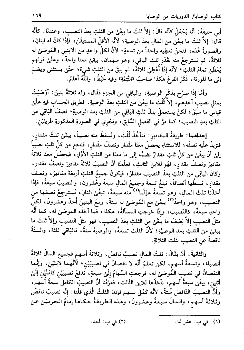 أبي حنيفةَ: أنَّه يُجْعَلُ كأنَّه قَالَ: إلاَّ ثلثَ ما يبقَى من الثلثِ بعدَ النصيب، وعندنَا: كأنَّه قال: إلاَّ ثلثَ ما يبقَى من المالِ بعدَ الوصيةِ؛ لأنَّه الأقلّ المستيقَنُ، فإذَا كانَ له ابنانِ، والصورةُ هذه، فنحنُ نعطِيه واحداً من تسعةٍ؛ لأنَّ لكلِّ واحدٍ من الابنينِ والمَوصَى له ثلاثةً، ثم نسترجعُ منه بقَدْرِ ثلثِ الباقِي، وهو سهمانِ، يبقى معنا واحدٌ، وعلَى قولهم يُعْطَى تمامُ الثلثِ؛ لأنَّه إِذَا أعْطِيَ ثلاثةً، لم يبقَ من الثلثِ شيءٌ؛ حتَّى يستثنى ويضمَ إلى ما للورثة، ذَكَرَ الفرعَ هكذا صاحبُ "التَّتِمَّةِ" وفيه خَبْطٌ، واللهُ أعلمُ.