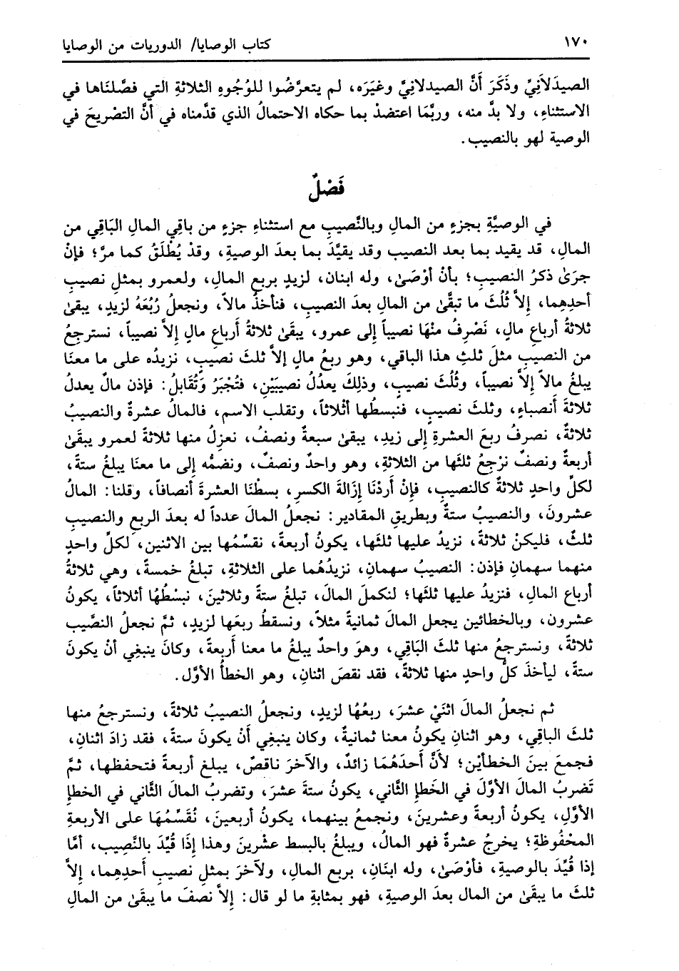 في الوصيَّةِ بجزءٍ من المالِ وبالنَّصيبِ مع استثناءِ جزءٍ من باقِي المالِ البَاقِي من المالِ، قد يقيد بما بعد النصيب وقد يقيَّدَ بما بعدَ الوصيةِ، وقدْ يُطْلَق كما مرَّ؛ فإنْ جرَى ذكرُ النصيب؛ بأنْ أوْصَى، وله ابنان، لزيدٍ بربع المالِ، ولعمرو بمثلِ نصيبِ أحدِهِما، إِلاَّ ثُلُثَ ما تبقَّى من المالِ بعدَ النصيبِ، فنأخذُ مالاً، ونجعلُ رُبُعَهُ لزيدٍ، يبقى ثلاثةُ أرباع مالٍ، نَصْرِفُ منْهَا نصيبًا إِلى عمرو، يبقَى ثلاثةُ أَرباعِ مالٍ إِلاَّ نصيبًا، نسترجِعُ من النصيب مثلَ ثلثِ هذا الباقي، وهو ربعُ مالٍ إلاَّ ثلثَ نصيبٍ، نزيدُه على ما معنَا يبلغُ مالاً إِلاَّ نصيبًا، وثُلُثَ نصيب، وذلِكَ يعدُلُ نصيبَيْنِ، فتُجْبَرُ وتُقَابلُ: فإذن مالٌ يعدلُ ثلاثةَ أَنصباءٍ، وثلثَ نصيبٍ، فنبسطُها أثْلاثاً، وتقلب الاسم، فالمالُ عشرةٌ والنصيبُ ثلاثةٌ، نصرفُ ربعَ العشرةِ إِلى زيدِ، يبقى سبعةٌ ونصفُ، نعزِلُ منها ثلاثةً لعمرو يبقَى أربعةٌ ونصفٌ نرْجِعُ ثلثَها من الثلاثةِ، وهو واحدٌ ونصفٌ، ونضمُّه إِلى ما معنَا يبلغُ ستةً، لكلِّ واحدٍ ثلاثةٌ كالنصيب، فإِنْ أَردْنَا إِزَالةَ الكسرِ، بسطْنَا العشرةَ أنصافاً، وقلنا: المالُ عشرونَ، والنصيبُ ستةٌ وبطريقِ المقادير: نجعلُ المالَ عدداً له بعدَ الربع والنصيبِ ثلثٌ، فليكنْ ثلاثةٌ، نزيدُ عليها ثلثَها، يكونُ أربعةً، نقسِّمُها بين الاثنين، لكلِّ واحدٍ منهما سهمانِ فإذن: النصيبُ سهمانِ، نزيدُهُما على الثلاثةِ، تبلغ خمسةً، وهي ثلاثةُ أرباع المالِ، فنزيدُ عليها ثلثَها؛ لنكملَ المالَ، تبلغ ستةً وثلاثينَ، نبسْطُهُا أثلاثاً، يكونُ عشرون، وبالخطائين يجعل المالَ ثمانيةً مثلاً، ونسقطُ ربعَها لزيدٍ، ثمَّ نجعلُ النصِّيب ثلاثةً، ونسترجعُ منها ثلثَ البَاقِي، وهوَ واحدٌ يبلغُ ما معنا أَربعةً، وكانَ ينبغِي أنْ يكونَ ستةً، ليأخذَ كلُّ واحدٍ منها ثلاثةً، فقد نقصَ اثنانِ، وهو الخطأُ الأوَّل.
