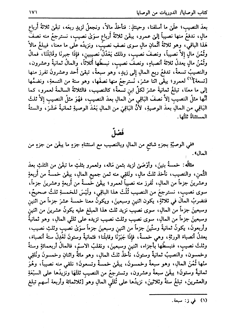 بعدَ النصيبِ؛ عَلَى ما أسلفنا، وحينئذٍ: فنأخذُ مالاً، ونجعلُ لزيدٍ ربعَه، تبقَى ثلاثةُ أَرباعِ مالٍ، ندفعُ منها نصيبًا إلى عمرو، يبقَى ثلاثةُ أَرباعٍ سوَى نصيبٍ، نسترجعُ منه نصفَ هَذا الباقي، وهو ثلاثةُ أثْمانِ مالٍ سوى نصفِ نصيبْ، ونزيدُه على ما معنا، فيبلغُ مالاً وثُمُنَ مالٍ إِلاَّ نصيبًا، ونصفَ نصيبٍ، وذلك يَعْدُلُ نصيبينِ، فإذَا جبرنَا وقَابَلْنَا، فمالٌ وثُمُنُ مالٍ يعدلُ ثلاثةَ أنصباءٍ، ونصفَ نصيبٍ، نبسطُها أَثلاثًا، والمالُ ثمانيةٌ وعشرون، والنصيبُ تسعةٌ، تدفعُ ربع المالِ إِلى زيدٍ، وهو سبعةٌ، تبقى أَحد وعشرونَ تفرز منها [تسعة] (¬1) لعمرو؛ يبقَى اثنا عشرَ، نَسترجعُ منها نصفَها، وهو ستة من التسعةِ، ونضمُّها إلى ما معنَا، تبلغُ ثمانيةَ عشرَ لكلِّ ابنٍ تسعةٌ؛ كالنصيب، فالثلاثةُ السالمةُ لعمرو، كما أنَّها مثلُ النصيب إلاَّ نصفَ البَاقِي من المالِ بعدَ النصيبِ، فهُوَ مثلُ النصيبِ إِلاَّ ثلثَ البَاقِي من المالِ بعدَ الوصيةِ؛ لأنَّ البَاقِيَ من المالِ بَعْدَ الوصيةِ ثمانيةُ عَشَرَ، والستةُ المستثناةُ ثلثُها.
