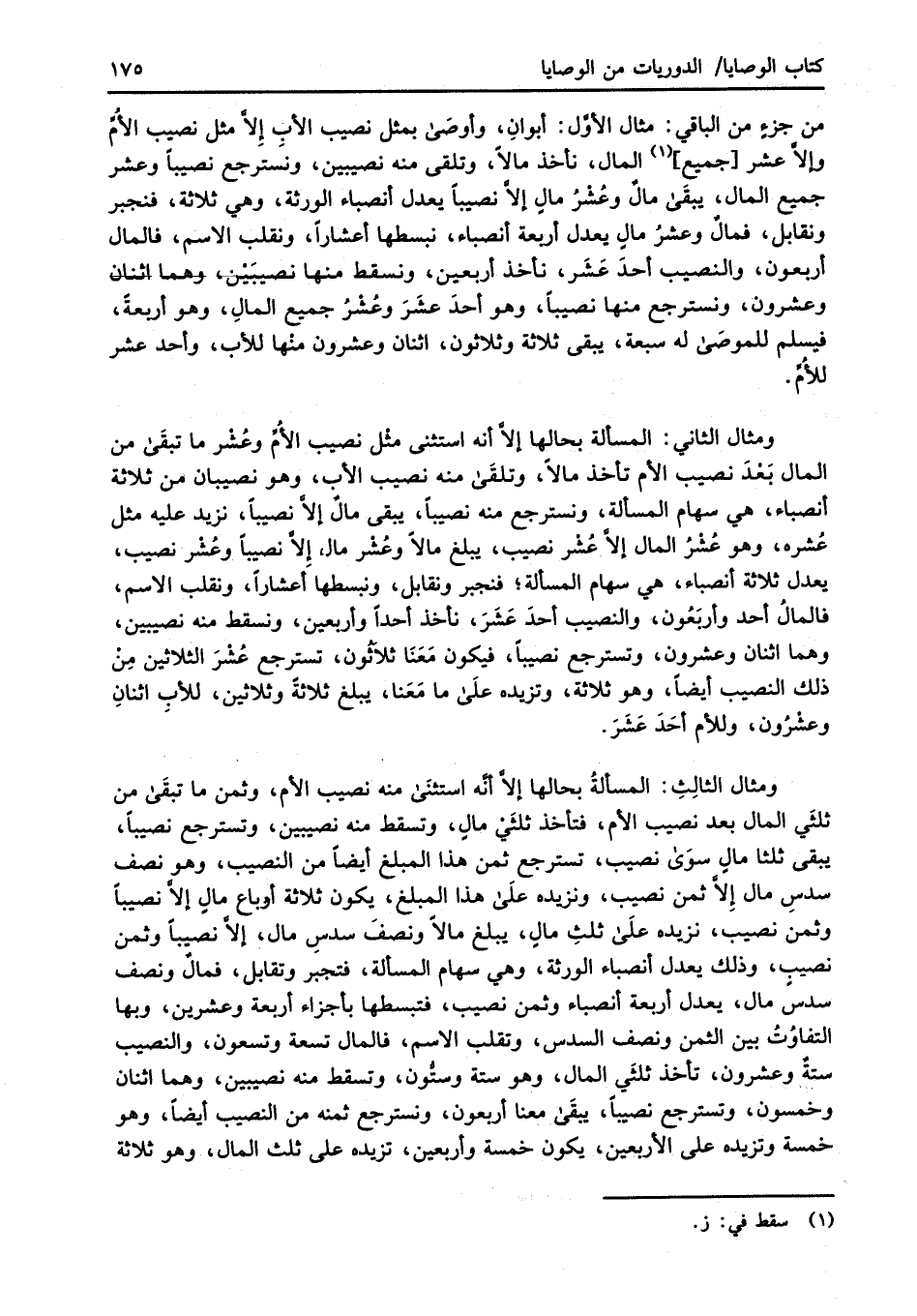ومثال الثاني: المسألة بحالها إلاَّ أنه استثنى مثْل نصيب الأُمِّ وعُشْر ما تبقَى من المال بَعْدَ نصيب الأم تأخذ مالاً، وتلقَى منه نصيب الأب، وهو نصيبان من ثلاثة أنصباء، هي سهام المسألة، ونسترجع منه نصيبًا، يبقى مالٌ إلاَّ نصيبًا، نزيد عليه مثل عُشره، وهو عُشْرُ المال إلاَّ عُشْر نصيب، يبلغ مالاً وعُشْر مال إِلاَّ نصيبًا وعُشْر نصيب، يعدل ثلاثة أنصباء، هي سهام المسألة؛ فنجبر ونقابل، ونبسطها أعشارًا، ونقلب الاسم، فالمالُ أحد وأربَعُون، والنصيب أحدَ عَشَرَ، نأخذ أحداً وأربعين، ونسقط منه نصيبين، وهما اثنان وعشرون، وتسترجع نصيبًا، فيكون مَعَنَا ثلاثون، تسترجع عُشْرَ الثلاثين مِنْ ذلك النصيب أيضاً، وهو ثلاثة، وتزيده عَلَى ما مَعَنا، يبلغ ثلاثةً وثلاثين، للأبِ اثنانِ وعشْرُون، وللأم أحَدَ عَشَرَ.