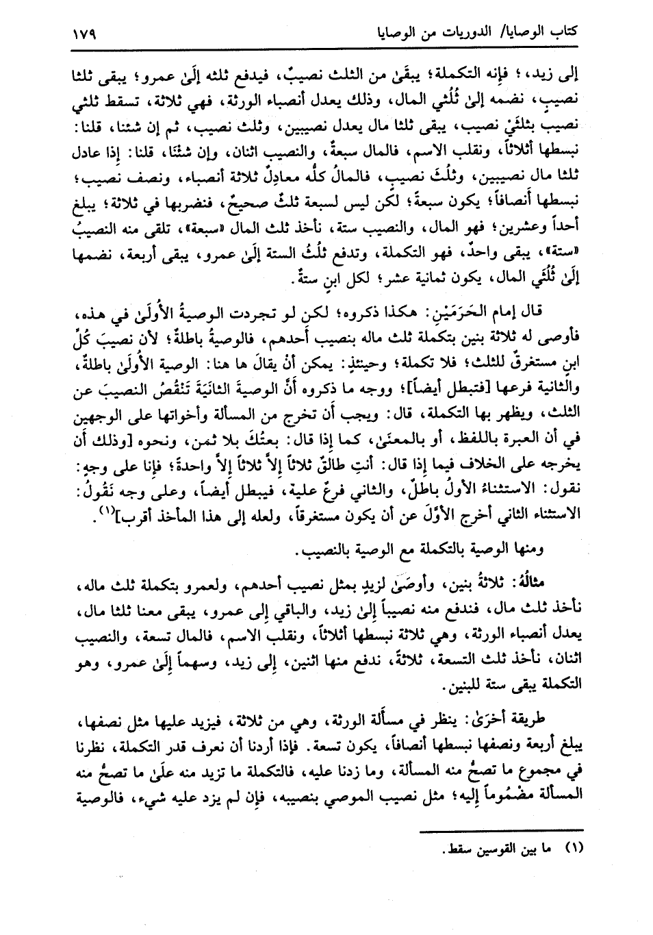إلى زيد؛ فإنه التكملة؛ يبقَى من الثلث نصيبٌ، فيدفع ثلثه إلَى عمرو؛ يبقى ثلثا نصيبٍ، نضمه إلى ثُلُثي المال، وذلك يعدل أنصباء الورثة، فهي ثلاثة، تسقط ثلثي نصيب بثلثَيْ نصيب، يبقى ثلثا مال يعدل نصيبين، وثلث نصيب، ثم إن شئنا، قلنا: نبسطها أثلاثًا، ونقلب الاسم، فالمال سبعةٌ، والنصيب اثنان، وإن شئْنَا، قلنا: إِذا عادل ثلثا مال نصيبين، وثلُثَ نصيبٍ، فالمالُ كلُّه معادِلٌ ثلاثة أنصباء، ونصف نصيب؛ نبسطها أَنصافًا؛ يكون سبعةً؛ لكن ليس لسبعة ثلثٌ صحيحٌ، فنضربها في ثلاثة؛ يبلغ أحدًا وعشرين؛ فهو المال، والنصيب ستة، نأخذ ثلث المال "سبعة"، تلقى منه النصيبُ "ستة"، يبقى واحدٌ، فهو التكملة، وتدفع ثلُثُ الستة إلَى عمرو، يبقى أربعة، نضمها إلَى ثُلُثَي المال، يكون ثمانية عشر؛ لكل ابنٍ ستةٌ.