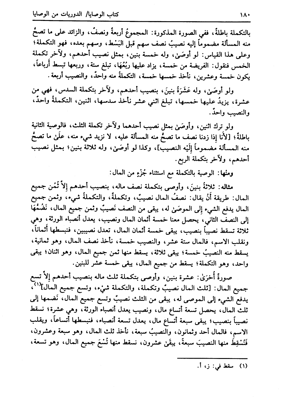 مثاله: ثلاثة بنينَ، وأوص بتكملة نصف ماله، بنصيب أحدهم إِلاَّ ثُمُن جميع المال؛ طريقة أَنْ يقال: نصفُ المال نصيبٌ، وتكملةٌ، والتكملةُ شيء، وثمن جميع المال يدفع الشيء إِلى الموصَى له، يبقى من النصف نَصيبٌ وثمن جميع المال، نَضُمُّهَا إلى النصف الثاني، يحصل معنا خمسة أثمان المال ونصيب، يعدل أنصباء الورثة، وهي ثلاثة تسقط نصيبًا بنصيب، يبقى خمسة أثمان المال، تعدل نصيبين، فنبسطها أَثمانًا، ونقلب الاسم، فالمال ستة عشر، والنصيب خمسة، نأخذ نصف المال، وهو ثمانية، يسقط منه النصيبُ خمسة؛ يبقى ثلاثة، يسقط منها ثمن جميع المال، وهو اثنان؛ يبقى واحد، وهو التكملة؛ يسقط من جميع المال، يبقى خمسة عشر للبنين.