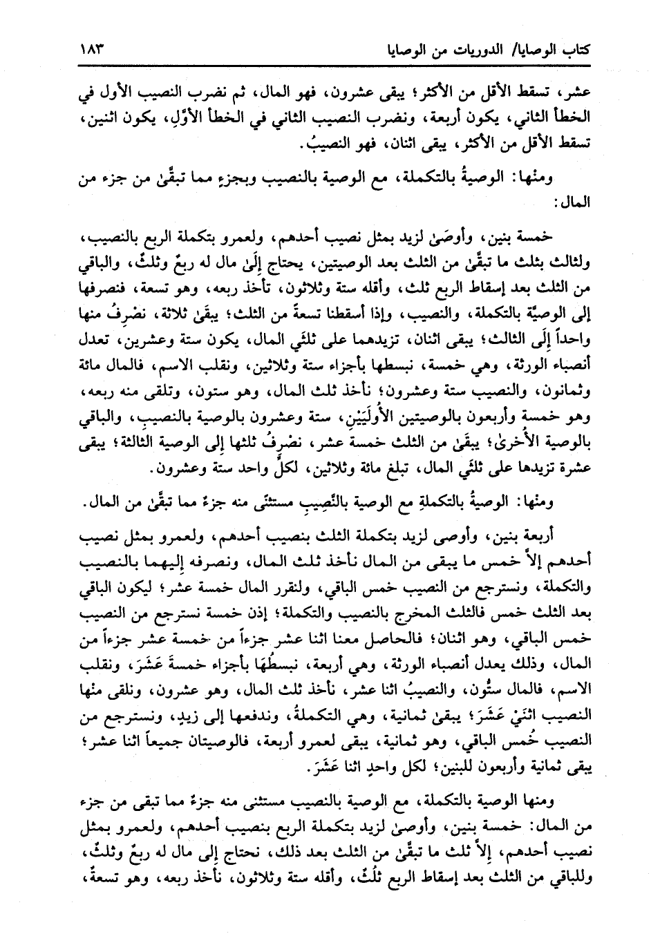 خمسة بنين، وأوصَى لزيد بمثل نصيب أحدهم، ولعمرو بتكملة الربع بالنصيب، ولثالث بثلث ما تبقَّى من الثلث بعد الوصيتين، يحتاج إلَى مال له ربعٌ وثلثٌ، والباقي من الثلث بعد إسقاط الربع ثلث، وأقله ستة وثلاثون، تأخذ ربعه، وهو تسعة، فنصرفها إلى الوصيَّة بالتكملة، والنصيب، وإذا أسقطنا تسعةً من الثلث؛ يبقَى ثلاثة، نصْرِفُ منها واحداً إِلَى الثالث؛ يبقى اثنان، تزيدهما على ثلثَي المال، يكون ستة وعشرين، تعدل أنصباء الورثة، وهي خمسة، نبسطها بأجزاء سنة وثلاثين، ونقلب الاسم، فالمال مائة وثمانون، والنصيب ستة وعشرون؛ نأخذ ثلث المال، وهو ستون، وتلقى منه ربعه، وهو خمسة وأربعون بالوصيتين الأُولَيَيْنِ، ستة وعشرون بالوصية بالنصيب، والباقي بالوصية الأُخرى؛ يبقَى من الثلث خمسة عشر، نصرفُ ثلثها إِلى الوصية الثالثة؛ يبقى عشرة تزيدها على ثلثَي المال، تبلغ مائة وثلاثين، لكلِّ واحد ستة وعشرون.