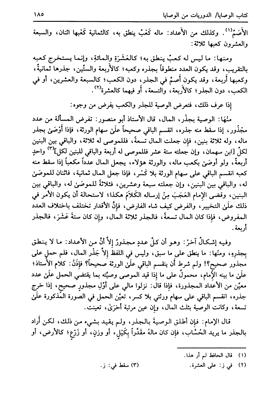 منْهَا: الوصية بجذْر، المال، قال الأستاذ أبو منصور: تفرض المسألة من عدد مجْذُور، إذا سقط منه جذره، انقسم الباقي صحيحاً عَلَى سهام الورثة، فإذا أَوْصَى بجذر ماله، وله ثلاثة بنين، فإِن جعلت المال تسعةً، فللموصى له ثلاثة، والباقي بين البنين لكلِّ [ابن سهمان، وإن جعلته ستة عشر فللموصى له أربعة والباقي للبنين لكل] (¬3) واحدٍ أربعةٌ، ولو أوصَى بكعب ماله، والورثة هؤلاء، يجعل المال عدداً مكعباً إذا سقط منه كعبه انقسم الباقي على سهام الورثة بلا كَسْر، فإذا جعل المال ثمانية، فاثنان للموصَى له، والباقي بين البنين، وإن جعلته سبعة وعشرين، فثلاثةً للموصَى له، والباقي بين البنين، وقضى الإمام العَجَبَ مِنْ إرساله الكَلاَمَ هكذا؛ لاستحالة أن يكون الأمر في ذلك عَلَى التخيير، والفرض كيف شاء الفارض، فإنَّ الأقدار تختلف باختلاف العدد المفروض، فهذا كان المال تسعةً، فالجذر ثلاثة المال، وإن كان ستةَ عَشَرَ، فالجذر أربعة.