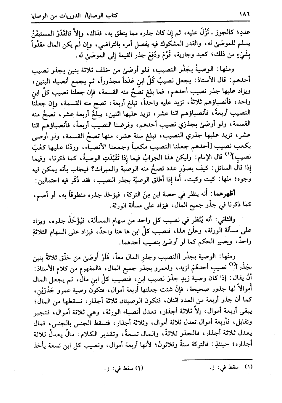 ومنْها: الوصية بجذْر [النصيب وجذرِ المال معاً، فَلَوْ أَوصَى من خلّق ثلاثةُ بنين بجَذْر] (¬2) نصيب أحدهُمْ لزيد، ولعمرو بجذر جميع المال، فالمفهوم من كلام الأستاذ: أنْ يقال: إذا كَان وصية زيدٍ جذْرَ نصيب ابن، فنصيب كلِّ ابنٍ مالٌ، ثم يجعل المال أَموالًا لها جذور صحيحة، فإنْ شئت جعلتها أَربعة أموال، فتكون وصية عمرو جَذْرَيْنِ، كما أن جذر أربعة من العدد اثنان، فتكون الوصيتان ثلاثة أجذار، نسقطها من المال؛ يبقى أربعة أموال، إلاَّ ثلاثة أجذار، تعدل أنصباء الورثة، وهي ثلاثة أموال، فتجبر وتقابل، فأربعة أموال تعدل ثلاثة أموال، وثلاثة أجذار، فتسقط الجنس بالجنس، فمال يعدل ثلاثة أجذار، فالجذر ثلاثةٌ، والمال تسعةٌ، وتقدير الكلام: مالٌ يعدلُ ثلاثة أجذاره؛ حينئذٍ: فالتركة ستةٌ وثلاثونَ؛ لأنها أربعة أموال، ونصيب كل ابن تسعة يأخذ