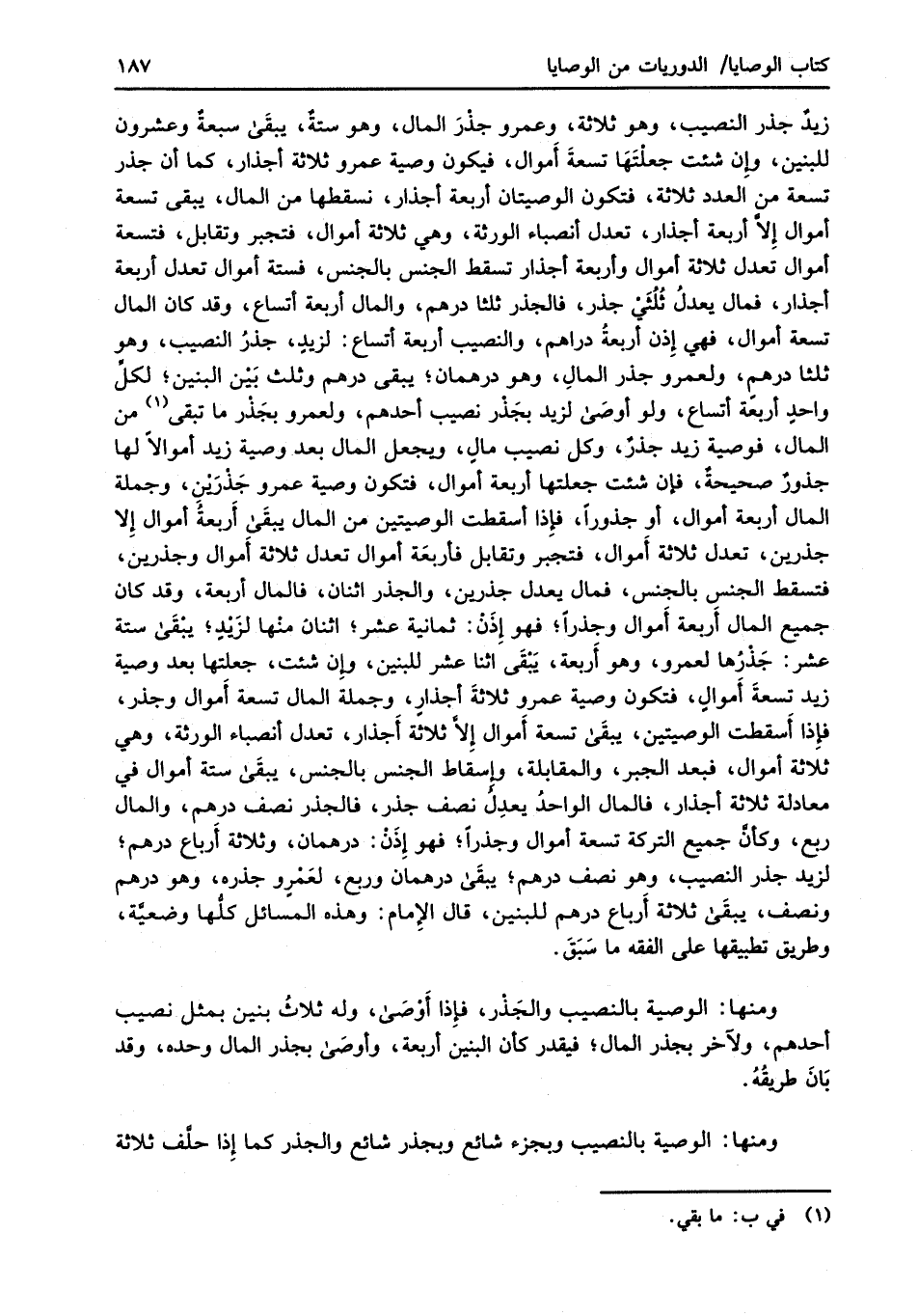 ومنها: الوصية بالنصيب والجَذْر، فإذا أَوْصَى، وله ثلاثُ بنين بمثل نصيب أحدهم، ولآخر بجذر المال؛ فيقدر كأن البنين أربعة، وأوصَى بجذر المال وحده، وقد بَانَ طريقُهُ.