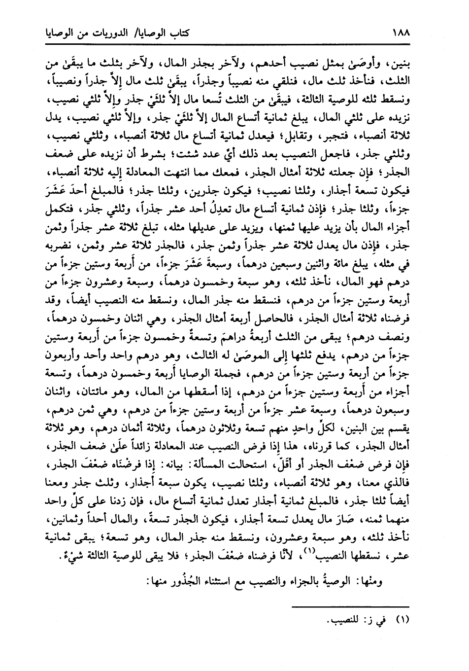 بنين، وأوصَى بمثل نصيب أحدهم، ولآخر بجذر المال، ولآخر بثلث ما يبقَى من الثلث، فنأخذ ثلث مال، فنلقي منه نصيبًا وجذرًا، يبقَى ثلث مال إِلاَّ جذراً ونصيباً، ونسقط ثلثه للوصية الثالثة، فيبقَى من الثلث تُسعا مال إلاَّ ثلثَي جذرٍ وإلاَّ ثلثي نصيب، نزيده على ثلثي المال، يبلغ ثمانية أتساع المال إلاَّ ثلثَيْ جذر، وإلاَّ ثلثي نصيب، يدل ثلاثة أنصباء، فتجبر، وتقابل؛ فيعدل ثمانية أتساع مال ثلاثة أنصباء، وثلثي نصيب، وثلثي جذر، فاجعل النصيب بعد ذلك أيَّ عدد شئت؛ بشرط أن نزيده على ضعف الجذر؛ فإن جعلته ثلاثة أمثال الجذر، فمعك مما انتهت المعادلة إِليه ثلاثة أنصباء، فيكون تسَعة أجذار، وثلثا نصيب؛ فيكون جذرين، وثلثا جذر؛ فالمبلغ أحدَ عَشَرَ جزءاً، وثلثا جذر؛ فإذن ثمانية أتساع مال تعدِلُ أحد عشر جذرًا، وثلثي جذر، فتكمل أجزاء المال بأن يزيد عليها ثمنها، ويزيد على عديلها مثله، تبلغ ثلاثة عشر جذراً وثمن جذر، فإذن مال يعدل ثلاثة عشر جذرًا وثمن جذر، فالجذر ثلاثة عشر وثمن، نضربه في مثله، يبلغ مائة واثنين وسبعين درهماً، وسبعةَ عَشَرَ جزءاً، من أَربعة وستين جزءاً من درهم فهو المال، نأخذ ثلثه، وهو سبعة وخمسون درهماً، وسبعة وعشرون جزءاً من أربعة وستين جزءاً من درهم، فنسقط منه جذر المال، ونسقط منه النصيب أيضاً، وقد فرضناه ثلاثة أمثال الجذر، فالحاصل أربعة أمثال الجذر، وهي اثنان وخمسون درهماً، ونصف درهم؛ يبقى من الثلث أربعةُ دراهمَ وتسعةٌ وخمسون جزءاً من أَربعة وستين جزءاً من درهم، يدفع ثلثها إِلى الموصَى له الثالث، وهو درهم واحد واحد وأربعون جزءاً من أربعة وستين جزءاً من درهم، فجملة الوصايا أَربعة وخمسون درهماً، وتسعة أجزاء من أَربعة وستين جزءاً من درهم، إذا أسقطها من المال، وهو مائتان، واثنان وسبعون درهماً، وسبعة عشر جزءاً من أربعة وستين جزءاً من درهم، وهي ثمن درهم، يقسم بين البنين، لكلِّ واحدٍ منهم تسعة وثلاثون درهماً، وثلاثة أثمان درهم، وهو ثلاثة أمثال الجذر، كما قررناه، هذا إِذا فرض النصيب عند المعادلة زائداً عَلَى ضعف الجذر، فإن فرض ضعْف الجذر أو أقَلّ، استحالت المسألة: بيانه: إِذا فرضْنَاه ضعْفَ الجذر، فالذي معنا، وهو ثلاثة أنصباء، وثلثا نصيب، يكون سبعة أجذار، وثلث جذر ومعنا أيضاً ثلثا جذر، فالمبلغ ثمانية أجذار تعدل ثمانية أتساع مال، فإن زدنا على كلِّ واحد منهما ثمنه، صَارَ مال يعدل تسعة أجذار، فيكون الجذر تسعةً، والمال أحداً وثمانين، نأخذ ثلثه، وهو سبعة وعشرون، ونسقط منه جذر المال، وهو تسعة؛ يبقى ثمانية عشر، نسقطها النصيب (¬1)، لأنَّا فرضناه ضعْفَ الجذر؛ فلا يبقى للوصية الثالثة شيْءٌ.