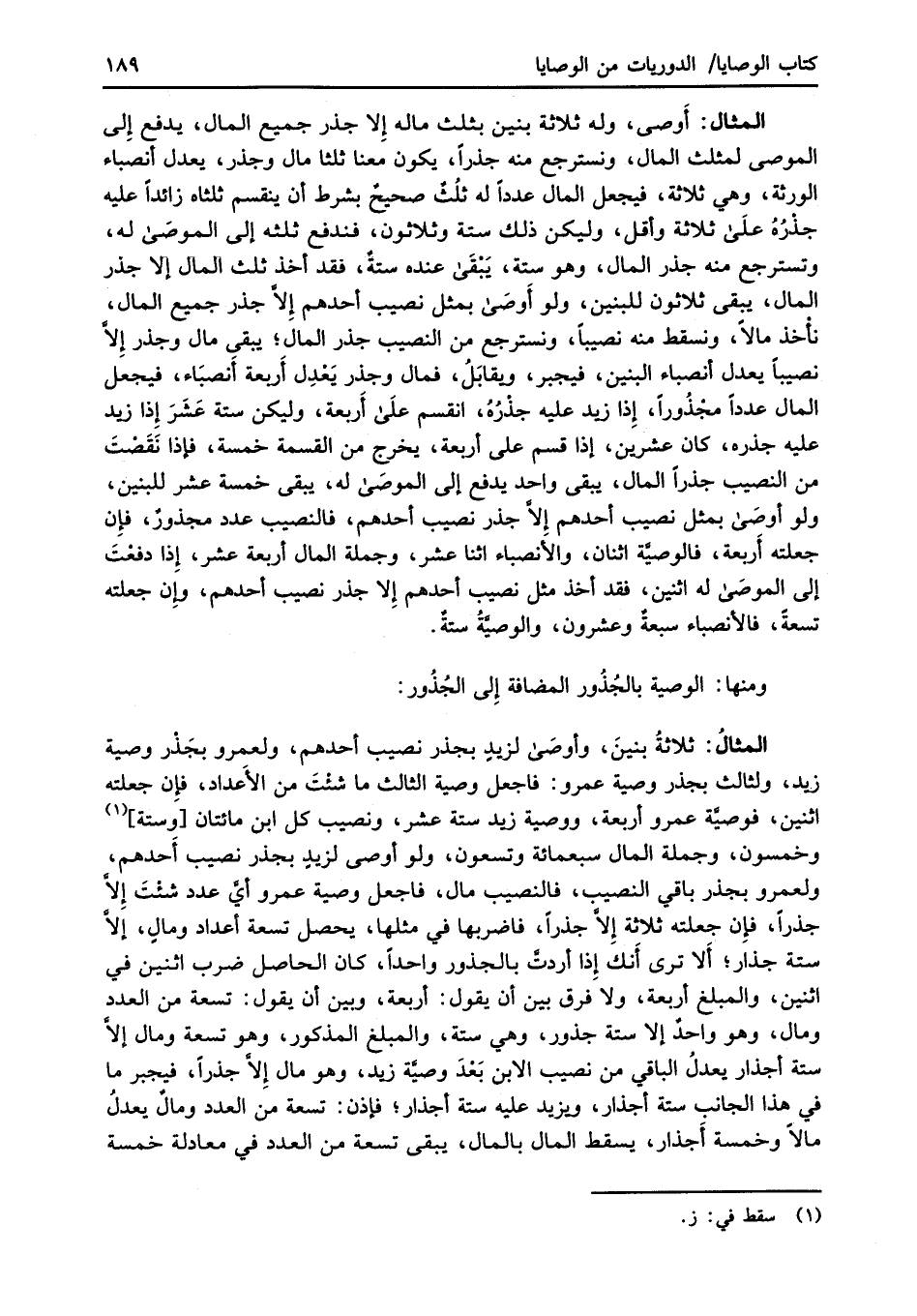 المثال: أَوصى، وله ثلاثة بنين بثلث ماله إِلا جذر جميع المال، يدفع إلى الموصى لمثلث المال، ونسترجع منه جذراً، يكون معنا ثلثا مال وجذر، يعدل أنصباء الورثة، وهي ثلاثة، فيجعل المال عدداً له ثلُثٌ صحيحٌ بشرط أن ينقسم ثلثاه زائداً عليه جذْرُهُ عَلَى ثلاثة وأقل، وليكن ذلك ستة وثلاثون، فندفع ثلثه إلى الموصَى له، وتسترجع منه جذر المال، وهو ستة، يَبْقَى عنده ستةٌ، فقد أخذ ثلث المال إلا جذر المال، يبقى ثلاثون للبنين، ولو أَوصَى بمثل نصيب أحدهم إلاَّ جذر جميع المال، نأْخذ مالاً، ونسقط منه نصيبًا، ونسترجع من النصيب جذر المالَ؛ يبقى مال وجذر إِلاَّ نصيبًا يعدل أنصباء البنين، فيجبر، ويقابَلُ، فمال وجذر يَعْدِل أَربعة أَنصبَاء، فيجعل المال عدداً مجْذُورًا، إِذا زيد عليه جذْرُهُ، انقسم عَلَى أَربعة، وليكن ستة عَشَرَ إِذا زيد عليه جذره، كان عشرين، إذا قسم على أربعة، يخرج من القسمة خمسة، فإذا نَقَصْتَ من النصيب جذرًا المال، يبقى واحد يدفع إلى الموصَى له، يبقى خمسة عشر للبنين، ولو أوصَى بمثل نصيب أحدهم إلاَّ جذر نصيب أحدهم، فالنصيب عدد مجذورٌ، فإِن جعلته أَربعة، فالوصيَّة اثنان، والأَنصباء اثنا عشر، وجملة المال أربعة عشر، إِذا دفعْتَ إلى الموصَى له اثنين، فقد أخذ مثل نصيب أحدهم إِلا جذر نصيب أحدهم، وإن جعلته تسعةً، فالأنصباء سبعةٌ وعشرون، والوصيَّةُ ستةٌ.