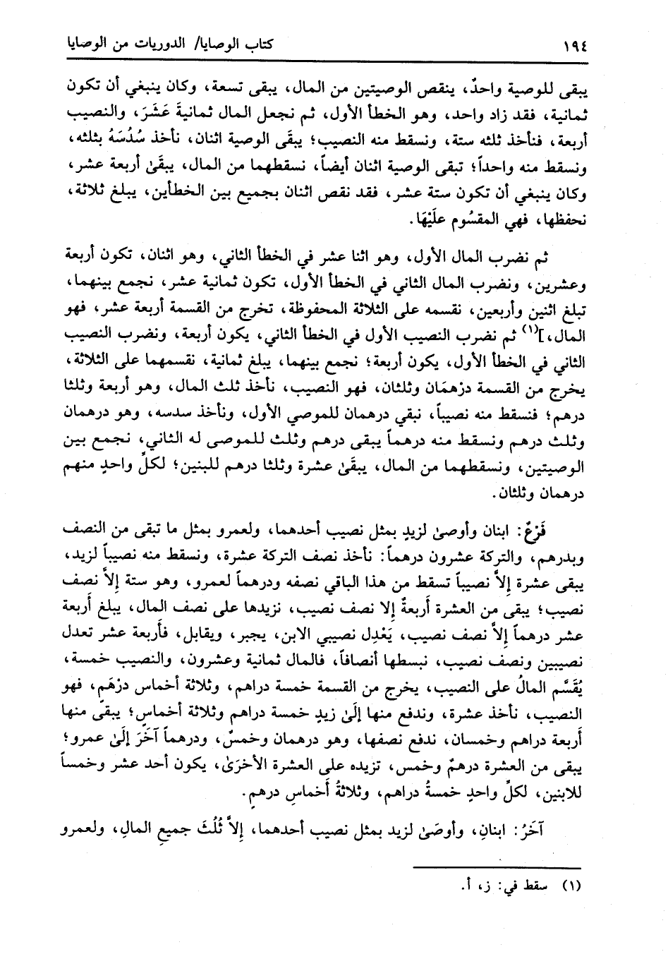 يبقى للوصية واحدٌ، ينقص الوصيتين من المال، يبقى تسعة، وكان ينبغي أن تكون ثمانية، فقد زاد واحد، وهو الخطأ الأول، ثم نجعل المال ثمانيةَ عَشَرَ، والنصيب أربعة، فنأخذ ثلثه ستة، ونسقط منه النصيب؛ يبقَى الوصية اثنان، نأخذ سُدُسَهُ بثلثه، ونسقط منه واحداً؛ تبقى الوصية اثنان أيضاً، نسقطهما من المال، يبقَى أربعة عشر، وكان ينبغي أن تكون ستة عشر، فقد نقص اثنان بجميع بين الخطأين، يبلغ ثلاثة، نحفظها، فهي المقسُوم علَيْهَا.