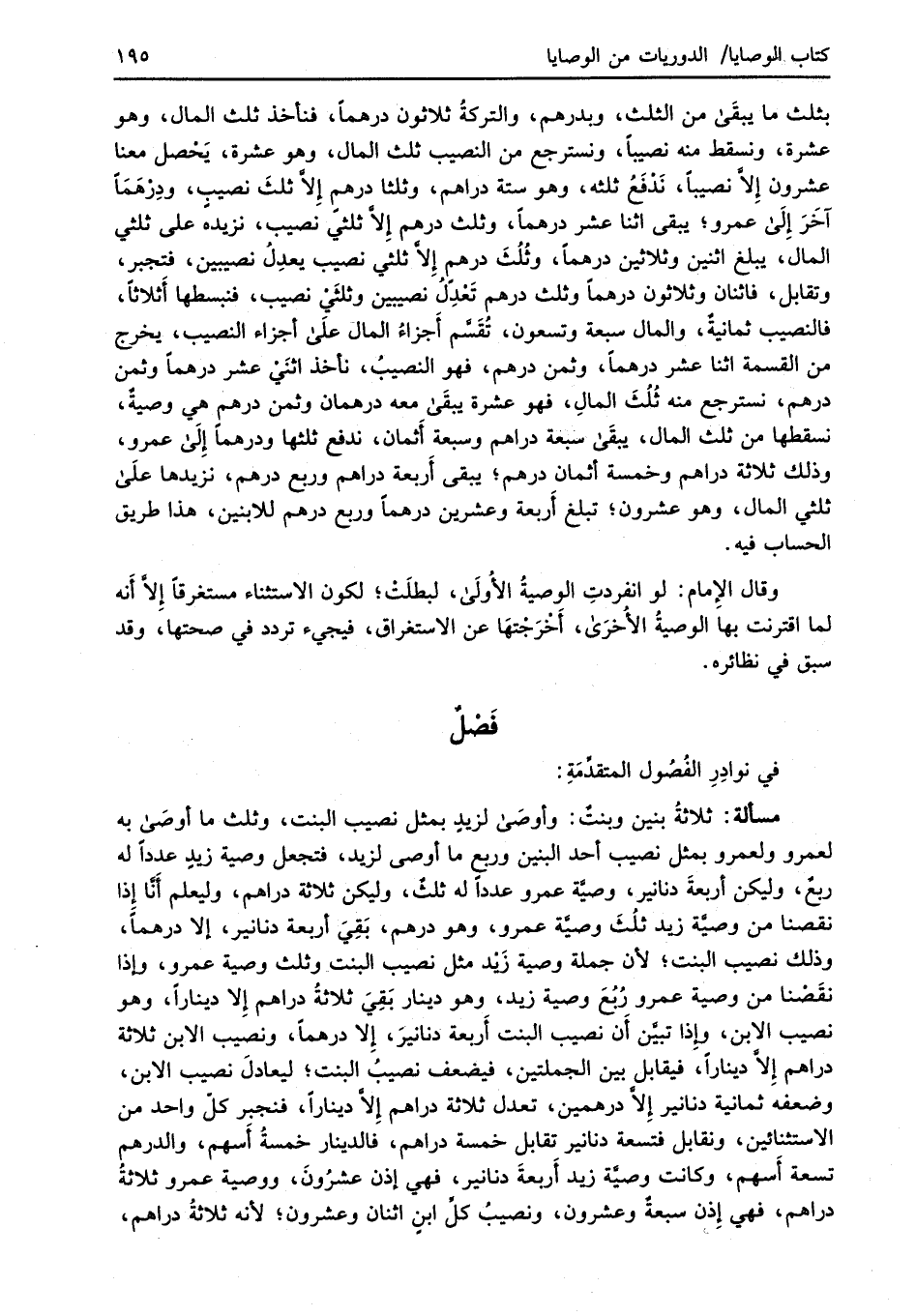 مسألة: ثلاثةُ بنين وبنتٌ: وأوصَى لزيدٍ بمثل نصيب البنت، وثلث ما أوصَى به لعمرو ولعمرو بمثل نصيب أحد البنين وربع ما أوصى لزيد، فتجعل وصية زيدٍ عدداً له ربعٌ، وليكن أربعةَ دنانير، وصيَّة عمرو عدداً له ثلثٌ، وليكن ثلاثة دراهم، وليعلم أَنَّا إِذا نقصنا من وصيَّة زيد ثلُثَ وصيَّة عمرو، وهو درهم، بَقِيَ أربعة دنانير، إلا درهماً، وذلك نصيب البنت؛ لأن جملة وصية زَيْد مثل نصيب البنت وثلث وصية عمرو، وإذا نقَصْنا من وصية عمرو رُبُعَ وصية زيد، وهو دينار بَقِيَ ثلاثةُ دراهم إِلا ديناراً، وهو نصيب الابن، وإِذا تبيَّن أَن نصيب البنت أَربعة دنانيرَ، إِلا درهماً، ونصيب الابن ثلاثة دراهم إِلاَّ ديناراً، فيقابل بين الجملتين، فيضعف نصيبُ البنت؛ ليعادلَ نصيب الابن، وضعفه ثمانية دنانير إِلاَّ درهمين، تعدل ثلاثة دراهم إِلاَّ ديناراً، فنجبر كل واحد من الاستثنائين، ونقابل فتسعة دنانير تقابل خمسة دراهم، فالدينار خمسةُ أَسهم، والدرهم تسعة أَسهم، وكانت وصية زيد أَربعةَ دنانير، فهي إذن عشرُونَ، ووصية عمرو ثلاثةُ دراهم، فهي إِذن سبعة وعشرون، ونصيبُ كلِّ ابنٍ اثنان وعشرون؛ لأنه ثلاثةُ دراهم،