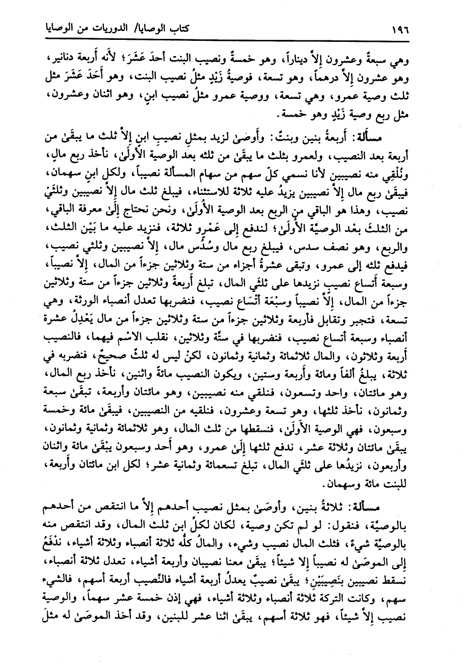 مسأَلة: أَربعةُ بنين وبنتٌ: وأَوصى لزيد بمثلِ نصيب ابنٍ إِلاَّ ثلث ما يبقَى من أربعة بعد النصيب، ولعمرو بثلث ما يبقَى من ثلثه بعد الوصَية الأولَى، نأخذ ربع مالٍ، ونُلقِي منه نصيبين لأنا نسمي كلّ سهم من سهام المسألة نصيبًا، ولكل ابنٍ سهمان، فيبقَى ربع مال إِلاَّ نصيبين يزيدُ عليه ثلاثة للاستثناء، فيبلغ ثلث مال إِلاَّ نصيبين وثلثَيْ نصيب، وهذا هو الباقي من الربع بعد الوصية الأُولَى، ونحن نحتاج إلَى معرفة الباقي، من الثلثَ بعْد الوصيَّة الأولَى؛ لندفع إلى عَمْرو ثلاثة، فنزيد عليَه ما بَيْن الثلث، والربع، وهو نصف سدس، فيبلغ ربع قال وسُدُس مال، إِلاَّ نصيبين وثلثي نصيب، فيدفع ثلثه إلى عمرو، وتبقى عشرةُ أجزاء من ستة وثلاثين جزءاً من المال، إلاَّ نصيبًا، وسبعة أَتساع نصيبٍ نزيدها على ثلثَي المال، تبلغ أَربعةً وثلاثين جزءاً من ستة وثلاثين جزءاً من المال، إِلاَّ نصيبًا وسبْعَة أتْسَاع نصيب، فنضربها تعدل أنصباء الورثة، وهي تسعة، فتجبر وتقابل فأربعة وثلاثين جزءاً من ستة وثلاثين جزءاً من مال يَعْدِلُ عشرة أنصباء وسبعة أتساع نصيب، فنضربها في ستَّة وثلاثين، نقلب الاسم فيهما، فالنصيب أَربعة وثلاثون، والمال ثلاثمائة وثمانية وثمانون، لكن ليس له ثلثٌ صحيح، فنضربه في ثلاثة، يبلغُ ألفًا ومائة وأَربعة وستين، ويكون النصيب مائةً واثنين، نأخذ ربع المال، وهو مائتان، واحد وتسعون، فنلقي منه نصيبين، وهو مائتان وأربعة، تبقَى سبعة وثمانون، نأخذ ثلثها، وهو تسعة وعشرون، فنلقيه من النصيبين، فيبقَى مائة وخمسة وسبعون، فهي الوصية الأَولَى، فنسقطها من ثلث المال، وهو ثلاثمائة وثمانية وثمانون، يبقَى مائتان وثلاثة عشر، ندفع ثلثها إِلَى عمرو، وهو أَحد وسبعون يبْقَى مائة واثنان وأربعون، نزيدُها على ثلثَي المال، تبلغ تسعمائة وثمانية عشر؛ لكل ابن مائتان وأَربعة، للبنت مائة وسهمان.