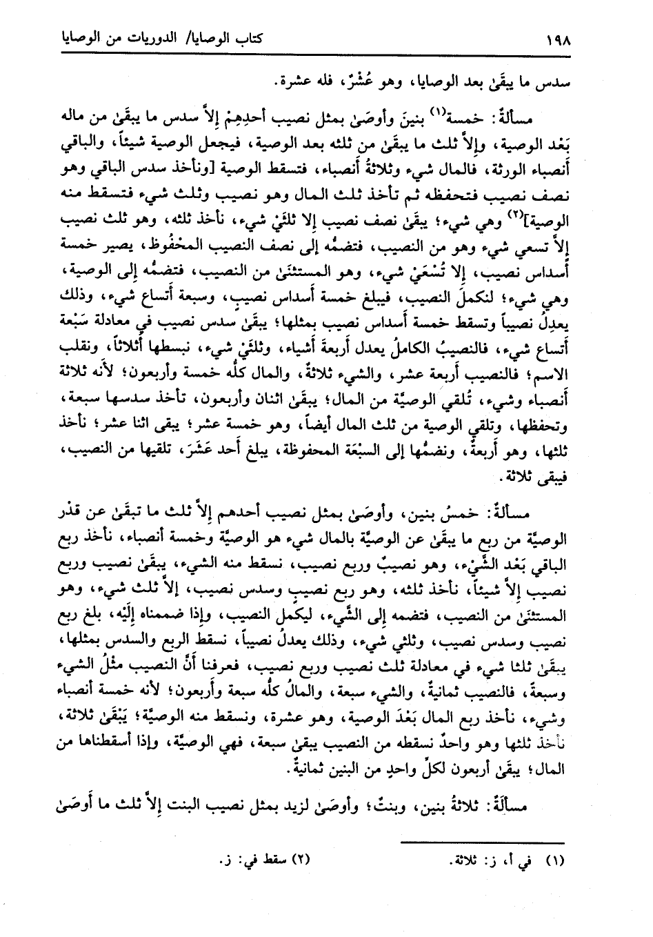 مسألةٌ: خمسُ بنين، وأوصَى بمثل نصيب أحدهم إِلاَّ ثلث ما تبقَى عن قدْر الوصيَّة من ربع ما يبقَى عن الوصيَّة بالمال شيء هو الوصيَّة وخمسة أنصباء، نأخذ ربع الباقي بَعْد الشَّيْء، وهو نصيبٌ وربع نصيب، نسقط منه الشيء، يبقَى نصيب وربع نصيب إِلاَّ شيئاً، نأخذ ثلثه، وهو ربع نصيب وسدس نصيب، إلاَّ ثلث شيء، وهو المستثنَى من النصيب، فتضمه إِلى الشَّيء، ليكمل النصيب، وإذا ضممناه إِلَيْه، بلغ ربع نصيب وسدس نصيب، وثلثي شيء، وذلك يعدلُ نصيبًا، نسقط الربع والسدس بمثلها، يبقَى ثلثا شيء في معادلة ثلث نصيب وربع نصيب، فعرفنا أَنَّ النصيب مثْلُ الشيء وسبعةً، فالنصيب ثمانيةٌ، والشيء سبعة، والمالُ كلُّه سبعة وأَربعون؛ لأنه خمسة أنصباء وشيء، نأخذ ربع المال بَعْدَ الوصية، وهو عشرة، ونسقط منه الوصيَّة؛ يَبْقَى ثلاثة، نأخذ ثلثها وهو واحدٌ نسقطه من النصيب يبقى سبعة، فهي الوصيَّة، وإذا أسقطناها من المال؛ يبقَى أربعون لكلِّ واحدٍ من البنين ثمانيةٌ.
