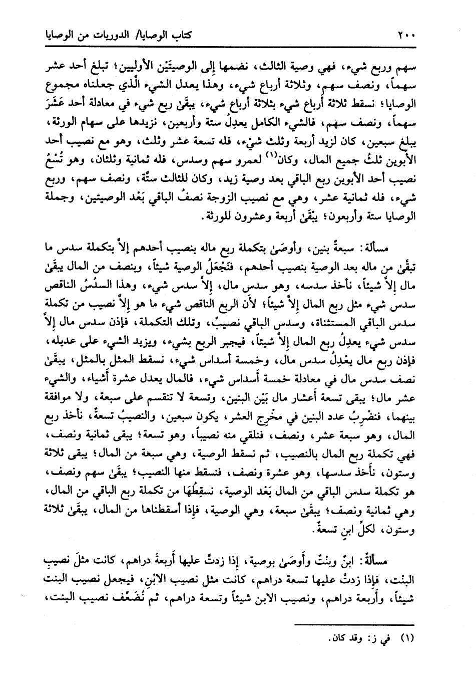 مسألة: سبعة بنين، وأوصَى بتكملة ربع ماله بنصيب أحدهم إلاَّ بتكملة سدس ما تبقَّى من ماله بعد الوصية بنصيب أحدهم، فنَجْعَلُ الوصية شيئاً، وبنصف من المال يبقَى مال إِلاَّ شيئاً، نأخذ سدسه، وهو سدس مال، إِلاَّ سدس شيء، وهذا السدُسُ الناقص سدس شيء مثل ربع المال إِلاَّ شيئاً؛ لأَن الربع الناقص شيء ما هو إِلاَّ نصيب من تكملة سدس الباقي المستثناة، وسدس الباقي نصيبٌ، وتلك التكملة، فإذن سدس مال إِلاَّ سدس شيء يعدِلُ ربع المال إِلاَّ شيئًا، فيجبر الربع بشيء، ويزيد الشيء على عديله، فإذن ربع مال يعْدِلُ سدس مال، وخمسة أسداس شيء، نسقط المثل بالمثل، يبقَى نصف سدس مال في معادلة خمسة أَسداس شيء، فالمال يعدل عشرة أَشياء، والشيء عشر مال؛ يبقى تسعة أَعشار مال بَيْن البنين، وتسعة لا تنقسم على سبعة، ولا موافقة بينهما، فنضْرِبُ عدد البنين في مخْرِج العشر، يكون سبعين، والنصيبُ تسعةٌ، نأخذ ربع المال، وهو سبعة عشر، ونصف، فنلقي منه نصيبًا، وهو تسعة؛ يبقى ثمانية ونصف، فهي تكملة ربع المال بالنصيب، ثم نسقط الوصية، وهي سبعة من المال؛ يبقى ثلاثة وستون، نأَخذ سدسها، وهو عشرة ونصف، فنسقط منها النصيب؛ يبقَى سهم ونصف، هو تكملة سدس الباقي من المال بَعْد الوصية، نسقِطُهَا من تكملة ربع الباقي من المال، وهي ثمانية ونصف؛ يبقَى سبعة، وهي الوصية، فإِذا أسقطناها من المال، يبقَى ثلاثة وستون، لكلِّ ابنٍ تسعةٌ.