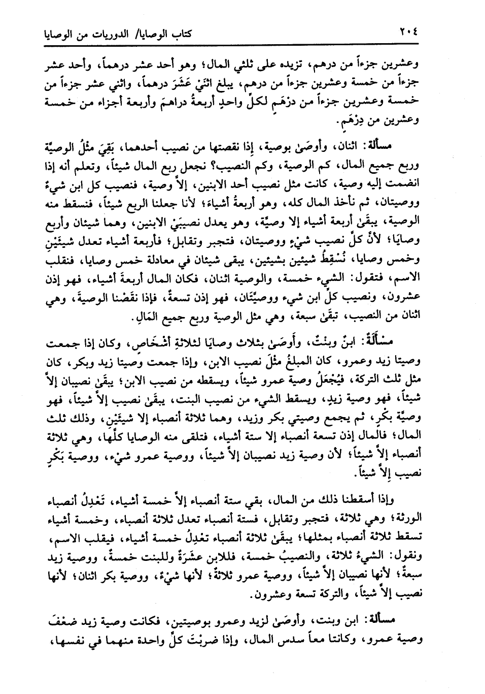 مسْاَلَةٌ: ابنٌ وبنْتٌ، وأَوصَى بثلاث وصايَا لثلاثةِ أشْخَاصٍ، وكان إذا جمعت وصيتا زيد وعمرو، كان المبلغُ مثْلَ نصيب الابن، وإذا جمعت وصيتا زيد وبكر، كان مثل ثلث التركة، فيُجْعَلُ وصية عمرو شيئاً، ويسقطه من نصيب الابن؛ يبقَى نصيبان إلاَّ شيئاً، فهو وصية زيدٍ، ويسقط الشيء من نصيب البنت، يبقَى نصيب إلاَّ شيئاً، فهو وصيَّة بكْرٍ، ثم يجمع وصيتي بكر وزيد، وهما ثلاثة أنصباء إلا شيئَينِ، وذلك ثلث المال؛ فالمال إذن تسعة أنصباء إلا ستة أشياء، فتلقى منه الوصايا كلَّها، وهي ثلاثة أنصباء إلاَّ شيئاً؛ لأن وصية زيد نصيبان إلاَّ شيئاً، ووصية عمرو شيْء، ووصية بَكْرٍ نصيب إِلاَّ شيئاً.