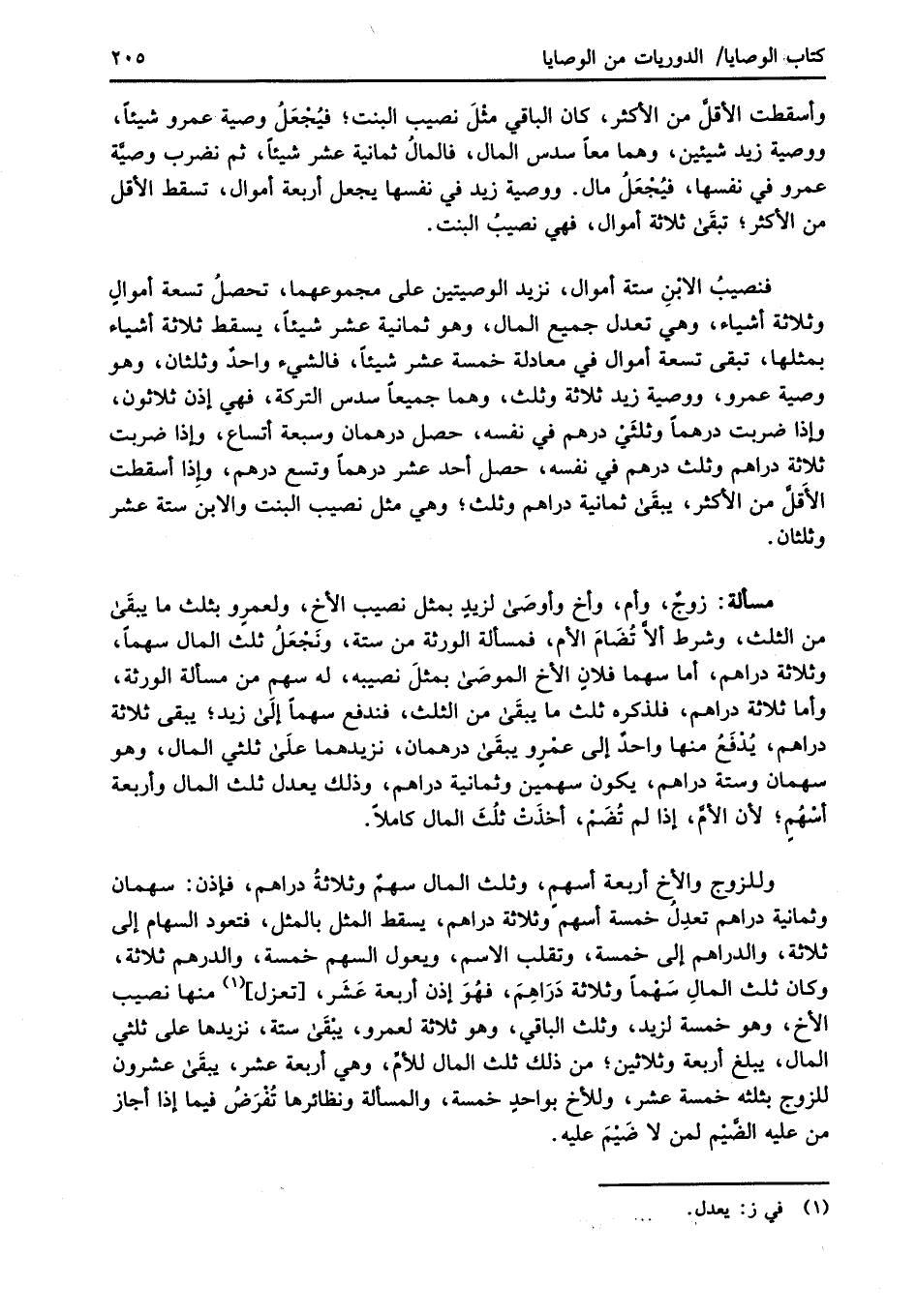 فنصيبُ الابْنِ ستة أموال، نزيد الوصيتين على مجموعهما، تحصلُ تسعة أموالٍ وثلاثة أشياء، وهي تعدل جميع المال، وهو ثمانية عشر شيئاً، يسقط ثلاثة أشياء بمثلها، تبقى تسعة أمو الذي معادلة خمسة عشر شيئاً، فالشيء واحدٌ وثلثان، وهو وصية عمرو، ووصية زيد ثلاثة وثلث، وهما جميعاً سدس التركة، فهي إذن ثلاثون، وإذا ضربت درهماً وثلثَيْ درهم في نفسه، حصل درهمان وسبعة أتساع، وإذا ضربت ثلاثة دراهم وثلث درهم في نفسه، حصل أحد عشر درهمًا وتسع درهم، وإِذا أسقطت الأَقلَّ من أكثر، يبقَى ثمانية دراهم وثلث؛ وهي مثل نصيب البنت والابن ستة عشر وثلثان.