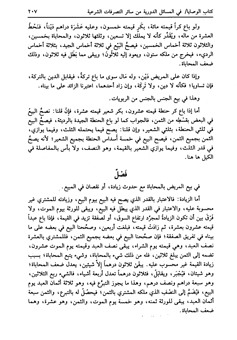 أما الزيادة: فالاعتبار بالقدر الذي يصح فيه البيع بيوم البيع، وزيادته للمشتري غير محسوبة عليه، والاعتبار في القدر الذي يبطل فيه البيع، ويبقى للورثة بيوم الموت، ولا فَرْقَ بين أن تكون الزيادةُ لمجرَّد ارتفاع السوق، أو لصفقة تزيد في القيمة، فإذا باع عبداً قيمته عشرون بعشرة، ثم زادَتْ قيمته، فبلغت أربعين، وصحَّحنا البيع في بعضه على ما بيناه في تفريق الصفقة؛ فإن صحَّحنا البيع في بعضه بجميع الثمن، فللمشتري بالعشرة نصف العبد، وهي قيمته يوم الشراء، يبقى نصف العبد وقيمته يوم الموت عشرون، تضمه إلى الثمن يبلغ ثلاثين، فله من ذلك شيء بالمحاباة، وشيء يتبع المحاباة؛ بسبب زيادة القيمة غير محسوب عليه. يبقَى ثلاثون درهماً إِلاَّ شيئين، يعدل ضعف المحاباة؛ وهو شيئان، فيُجْبَر، ويقابَلُ، فثلاثون درهماً تعدل أربعة أشياء، فالشيء ربع الثلاثين، وهو سبعة دراهم ونصف درهم، وهذا ما يجوز التبرُّع فيه، وهو ثلاثة أثمان العبد يوم البيع، فيُضَمُّ إلى النصْفِ الذي ملكه المشتري بالثمن؛ فيحصُلُ له بالتبرع، والثمن سبعة أثمان العبد، يبقى للورثة ثمنه، وهو خمسة يوم الموت، والثمن، وهو عشرة، وهما ضعف المحاباة.
